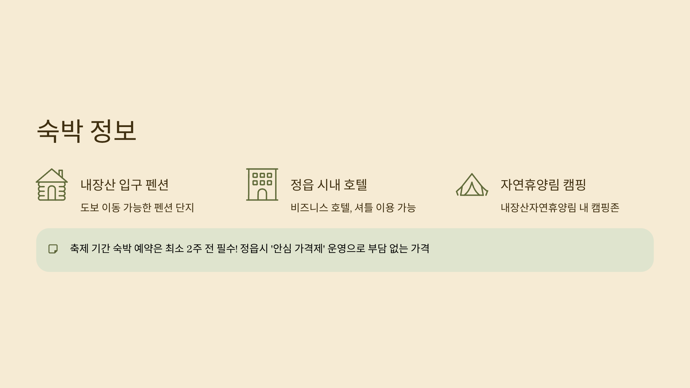 축제 후에는 정읍의 또 다른 명소인 ‘내장산문화광장’, ‘쌍화차 거리’, ‘정읍사공원’을 들러보는 것도 추천합니다.