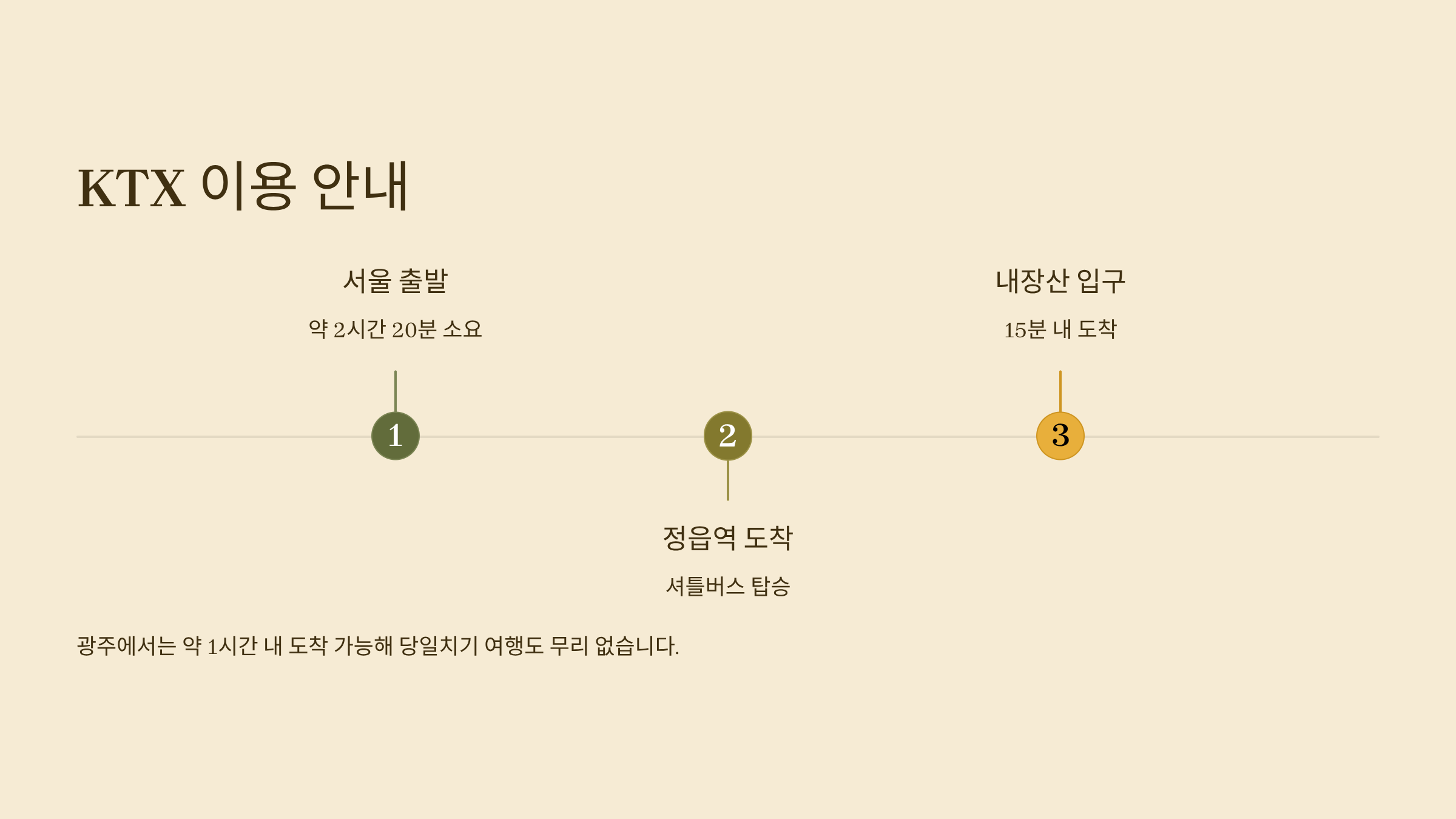 또한 정읍역 KTX를 이용하면 서울에서 약 2시간 20분, 광주에서는 약 1시간 내 도착 가능해 당일치기 여행도 무리 없습니다.
