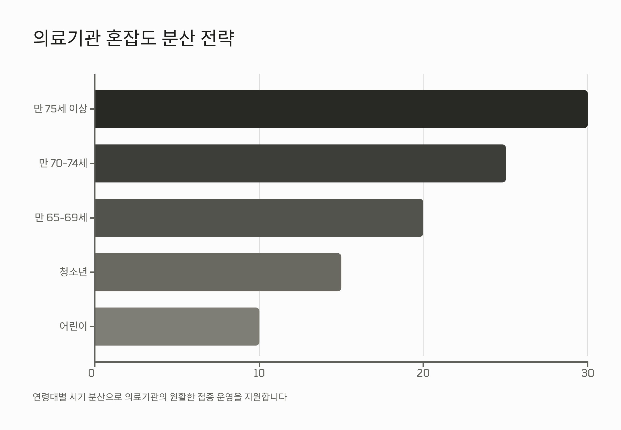 - 날짜 세분화: 만 75세 이상 어르신에게 먼저 날짜를 배정하고, 이후 만 70~74세, 만 65~69세 순으로 날짜를 분할하여 의료기관의 혼잡을 줄입니다.