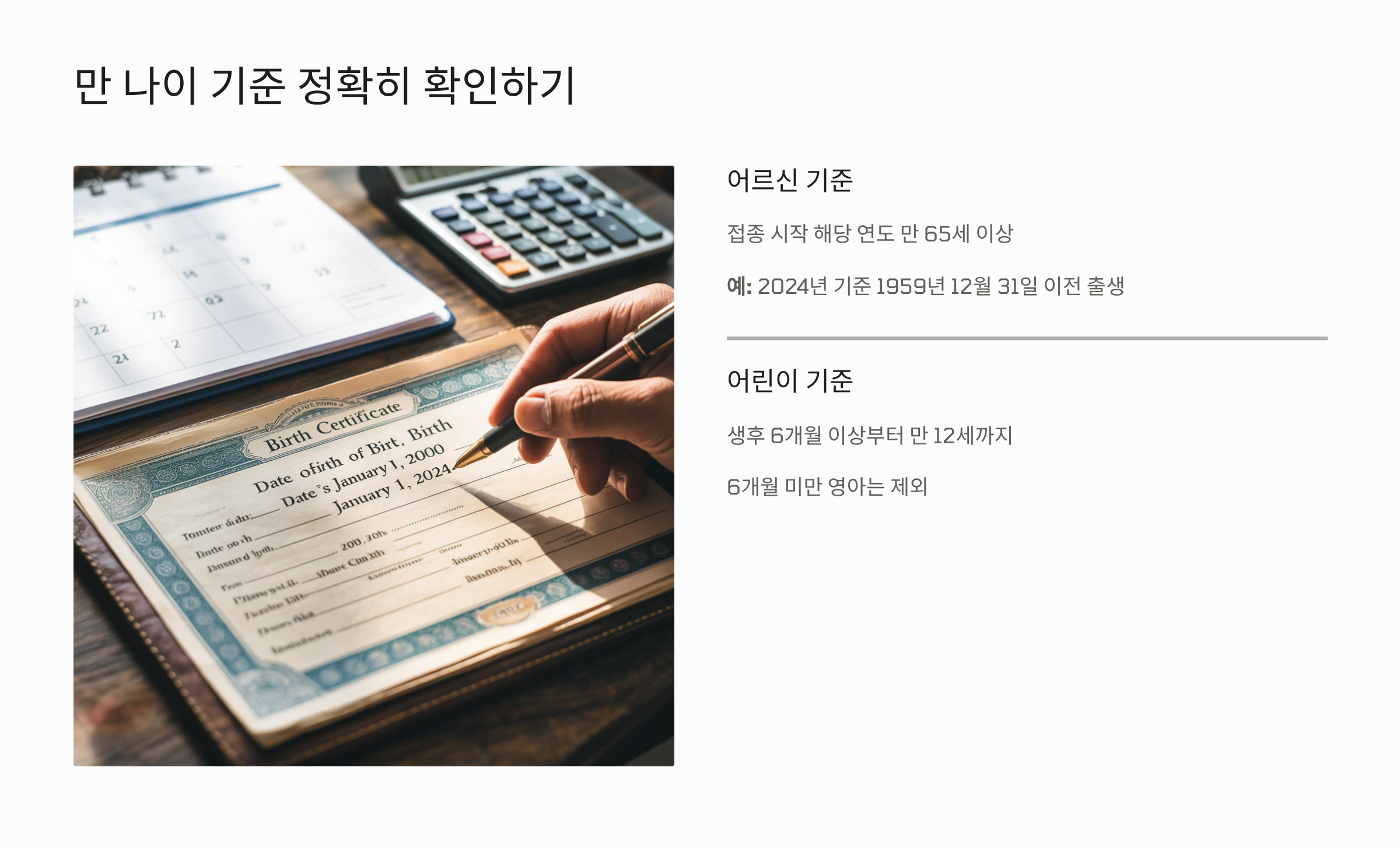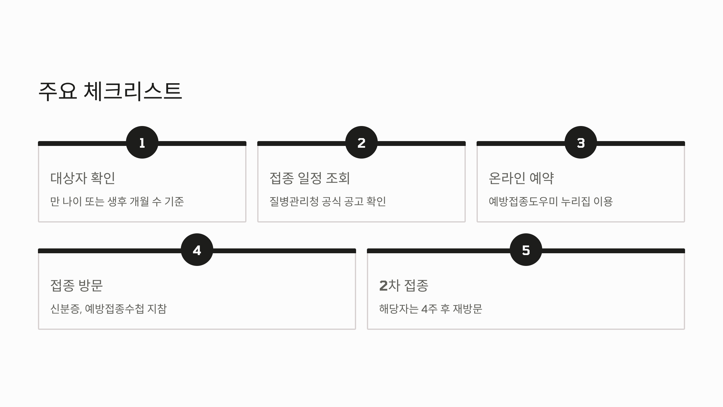 - 정확한 확인 절차: 질병관리청 '예방접종도우미' 누리집 또는 보건소를 통해 해당 연도의 구체적인 출생 연월일 기준을 조회하여 대상 여부를 확인해야 합니다.