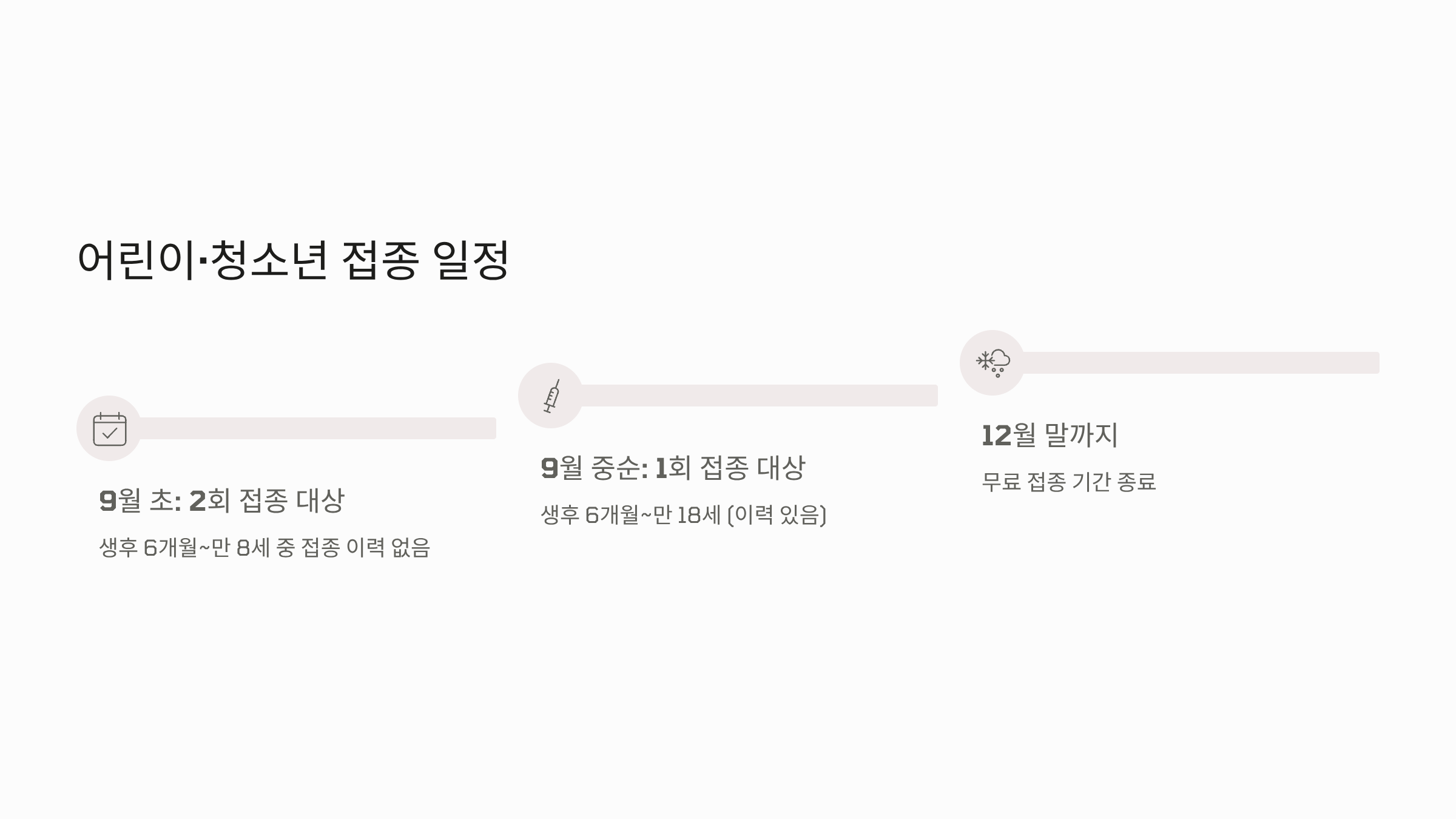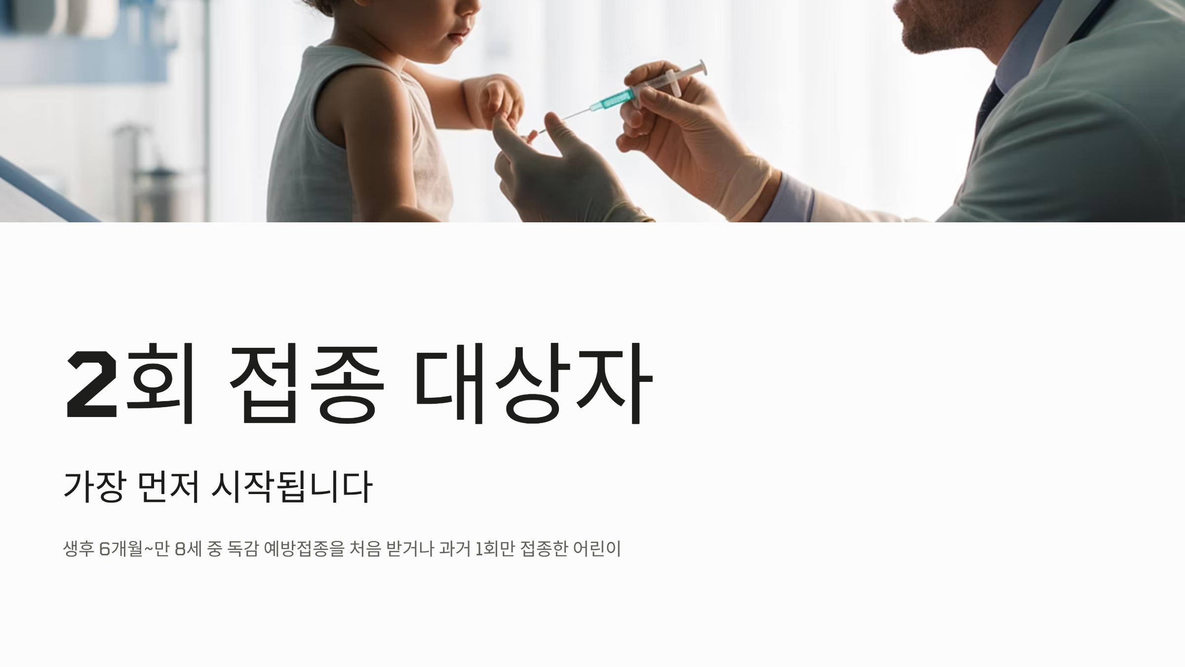- 날짜 세분화: 2회 접종이 필요한 어린이(생후 6개월~만 8세 중 접종 이력 없는 경우)가 가장 먼저 시작하며, 이후 1회 접종 대상 어린이 및 청소년의 날짜가 시작됩니다.