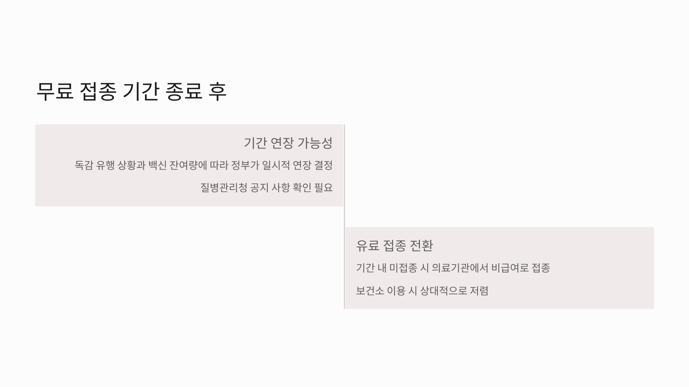- 유료 접종 전환: 기간 내에 접종을 하지 못하거나 연장되지 않은 경우, 의료기관에서 유료(비급여)로 접종해야 합니다.