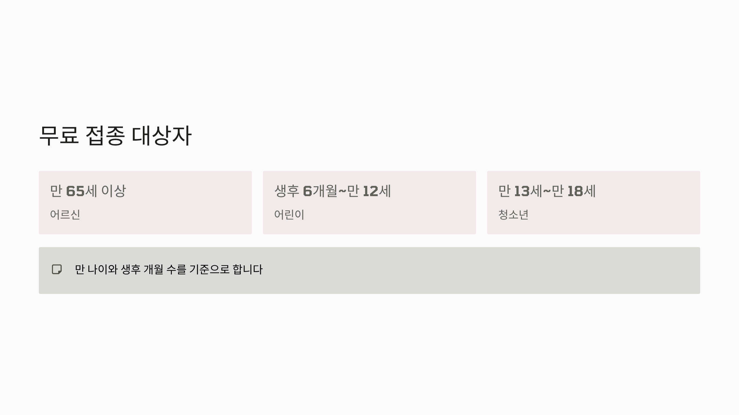 - 어르신: 접종이 시작되는 해당 연도의 만 65세 이상이 되는 모든 사람입니다. (예: 2024년 기준, 1959년 12월 31일 이전 출생자)
