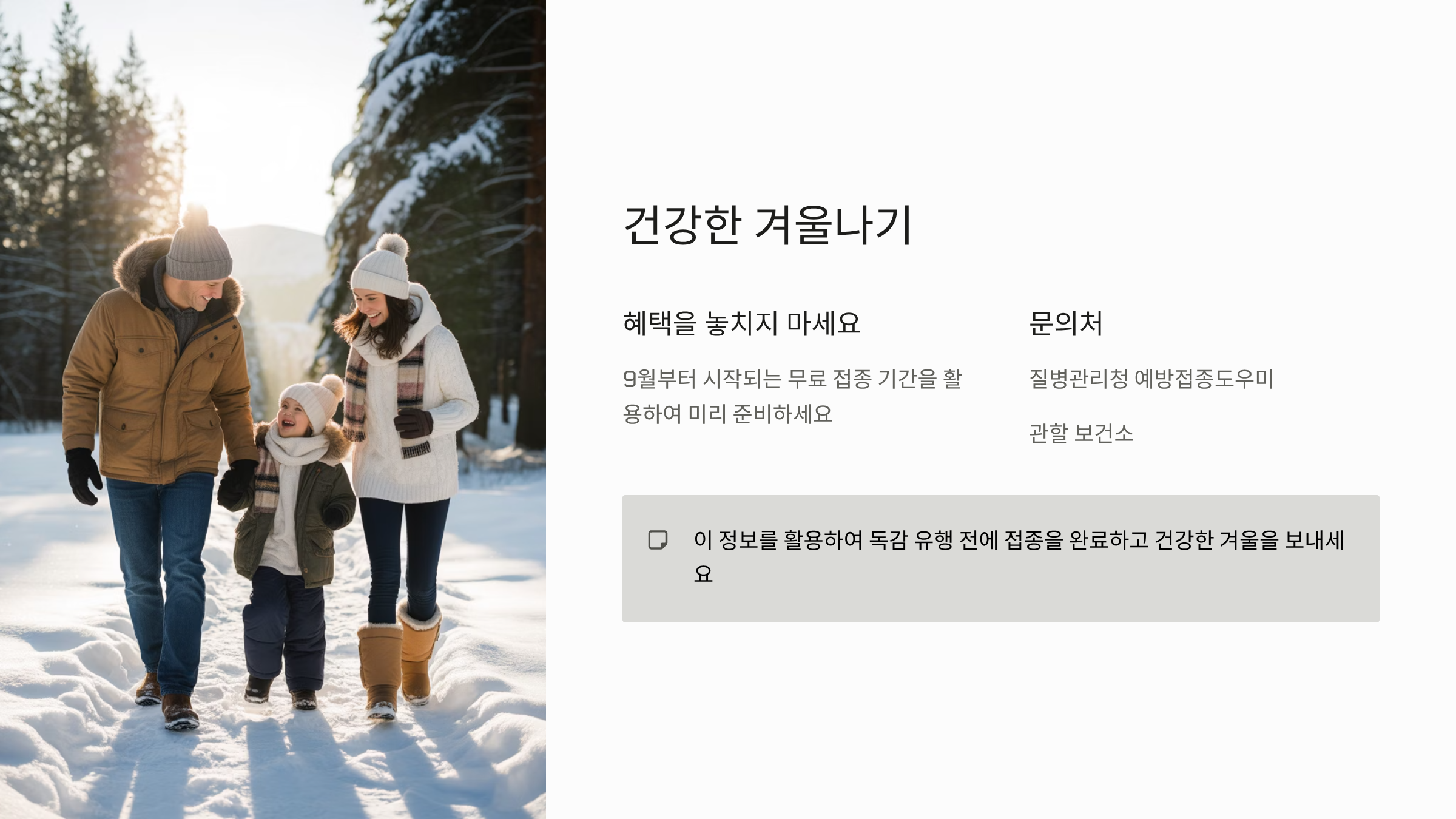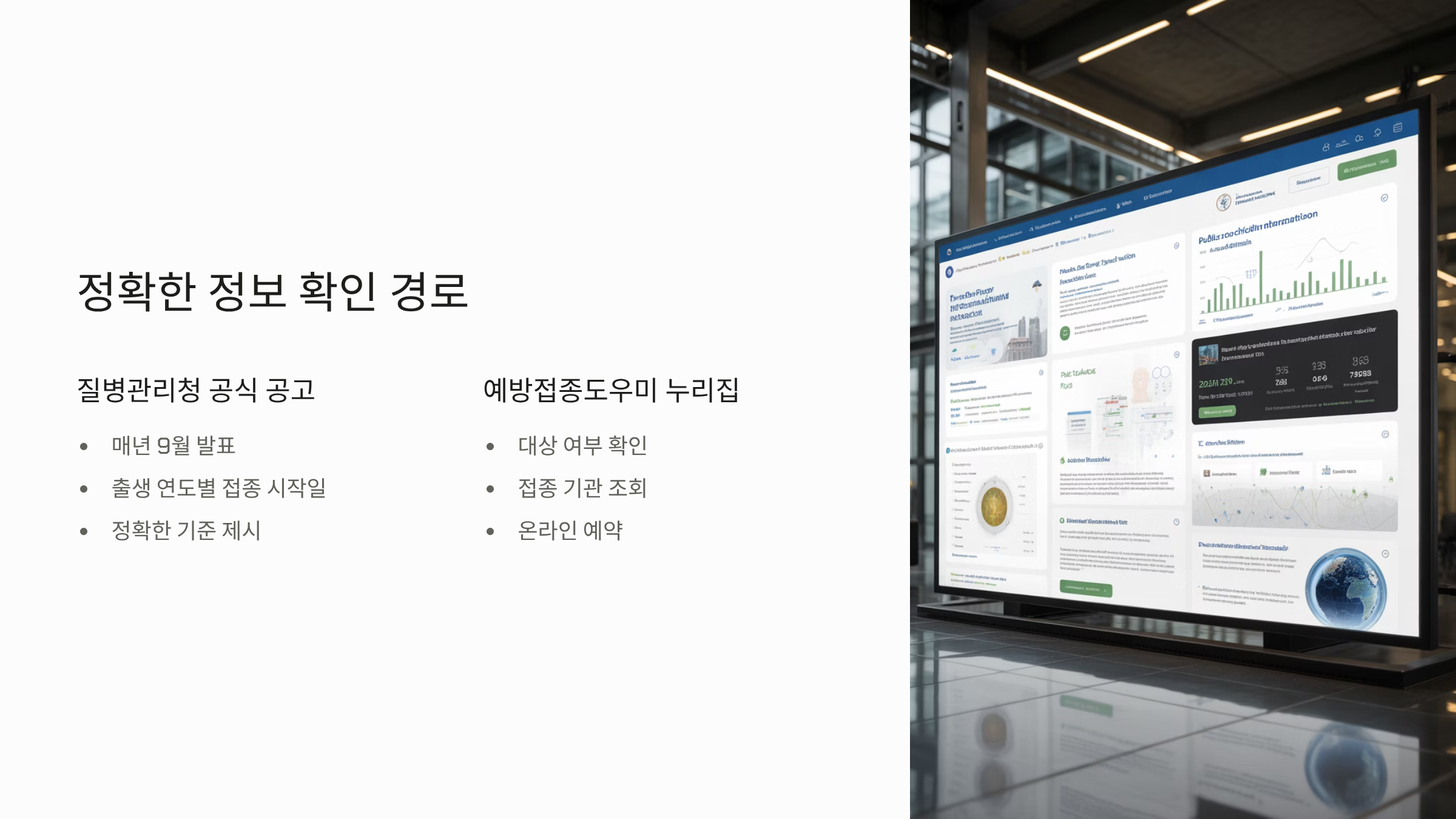 - 확인 방법: 매년 9월 질병관리청에서 발표하는 공식 공고문을 통해 해당 연도의 정확한 출생 연도별 접종 시작 날짜를 확인해야 합니다.