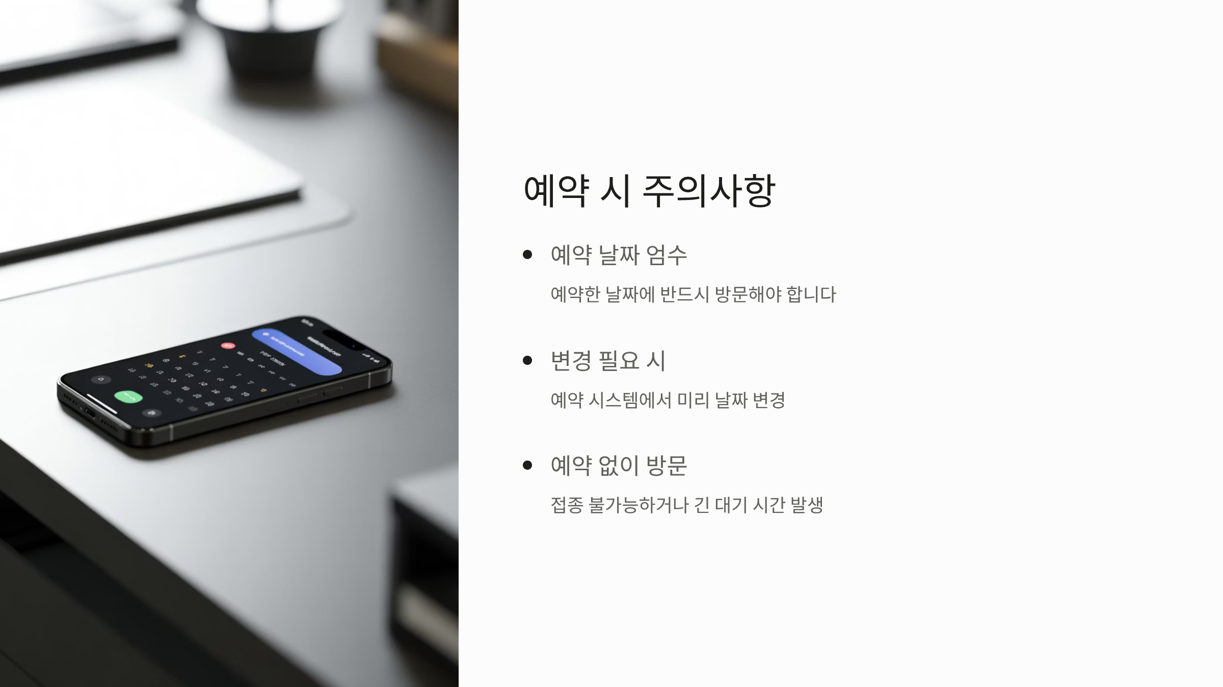 - 예약 주의사항: 예약한 날짜에 반드시 방문해야 하며, 개인 사정으로 날짜를 변경해야 할 경우 예약 시스템에서 미리 변경해야 합니다.