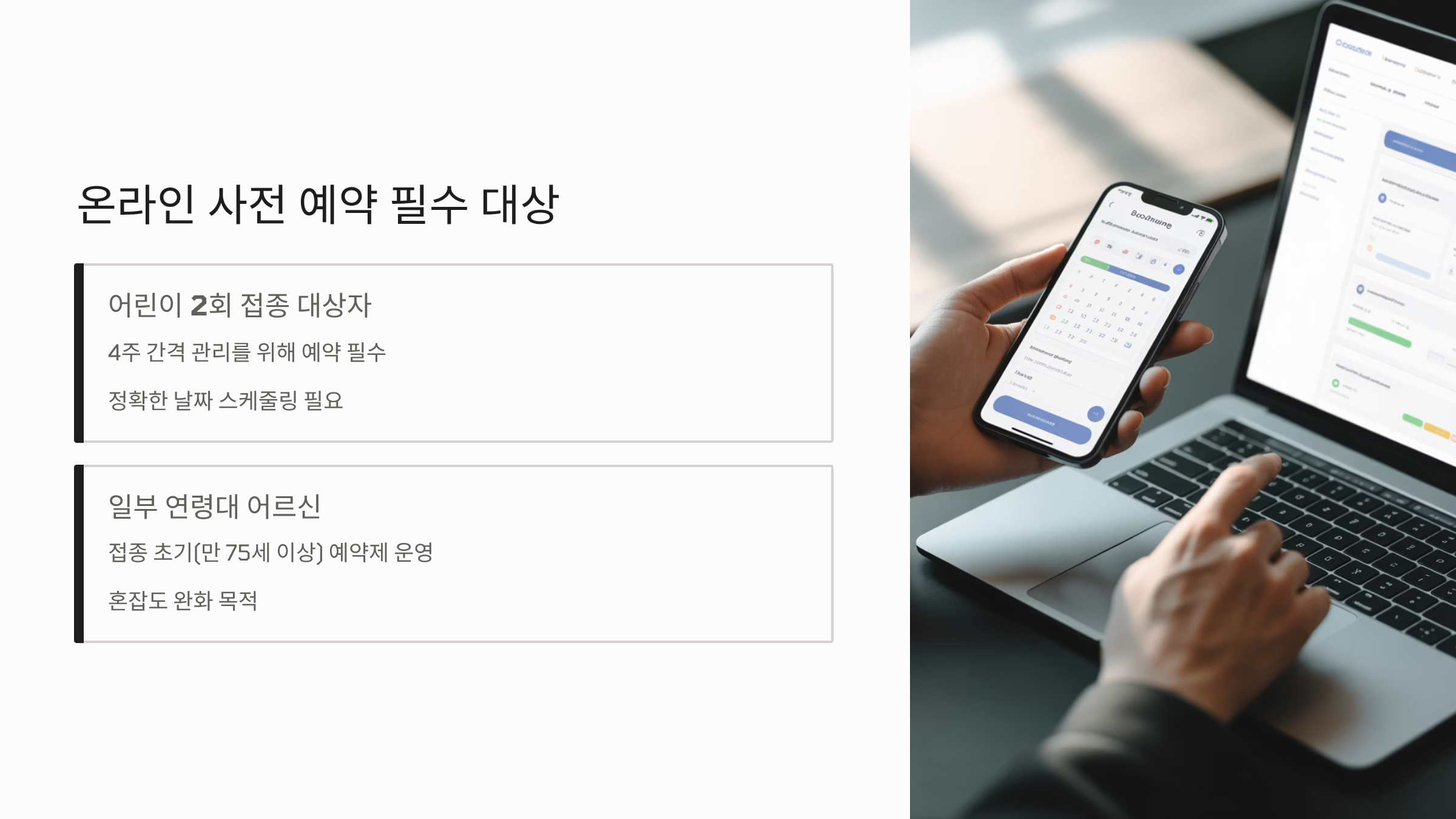 - 어린이 2회 접종 대상자: 2회 접종은 반드시 4주 간격을 지켜야 하므로, 정확한 날짜 관리를 위해 온라인 예약이 필수입니다.