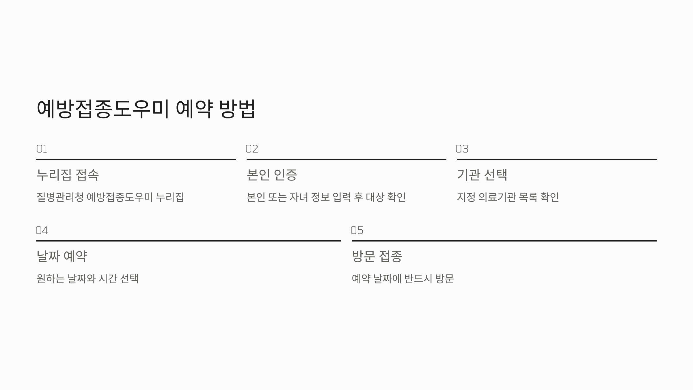 - 본인 인증 및 대상 확인: 본인 또는 자녀의 정보를 입력하여 무료 접종 대상자인지 확인합니다.