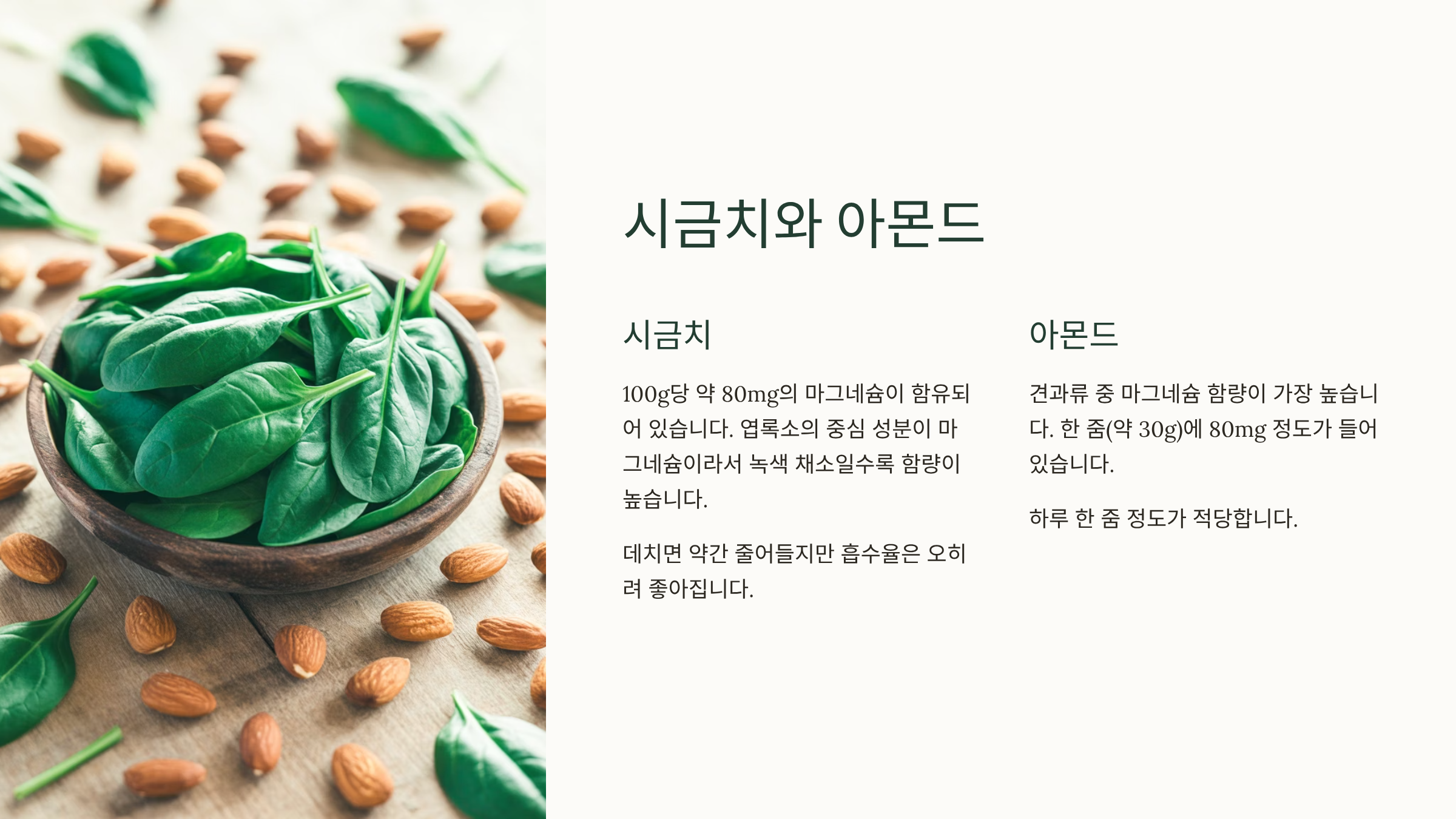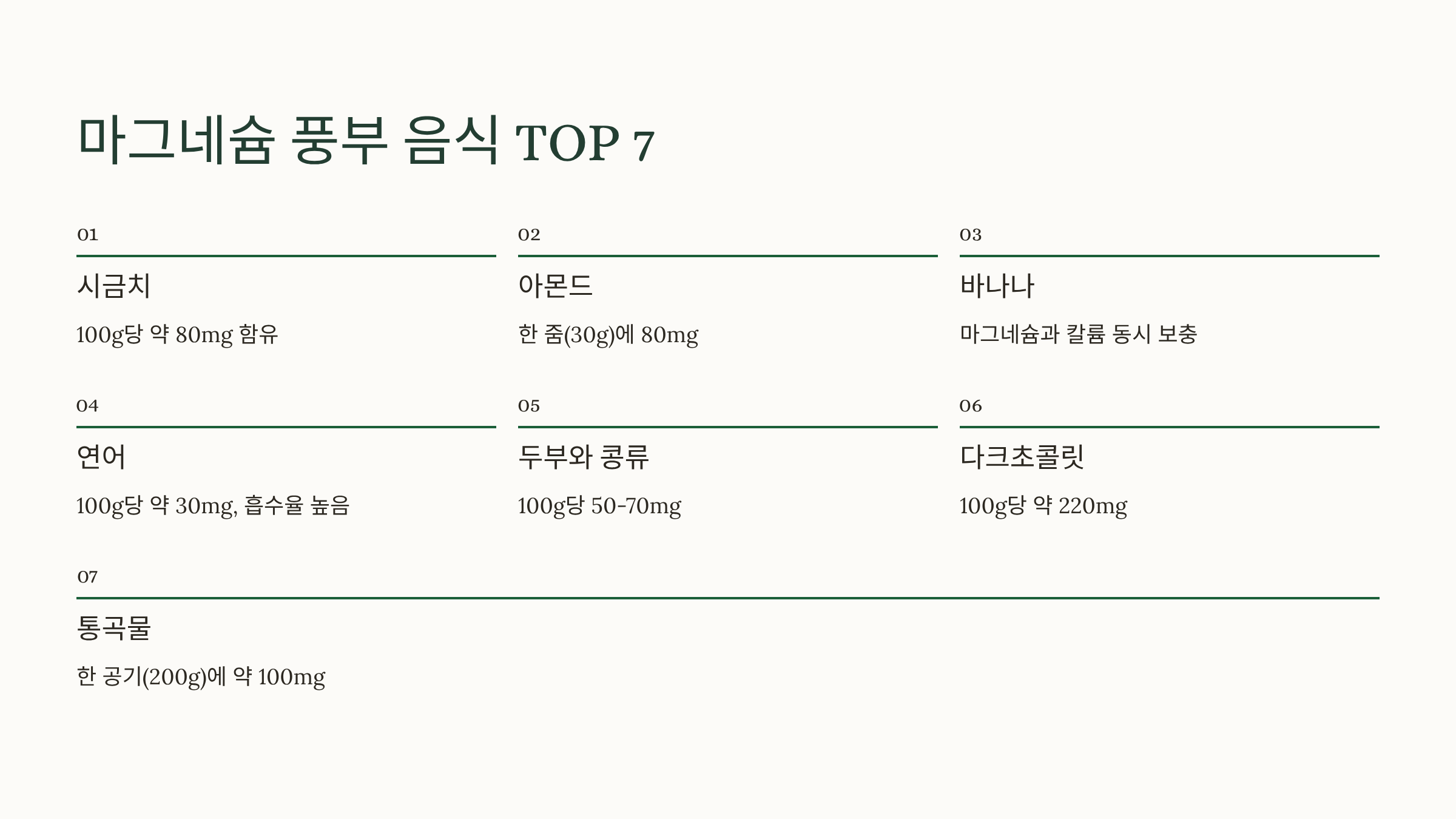 하루 한 끼라도 시금치, 아몬드, 바나나, 두부 같은 마그네슘 음식을 챙겨 먹는 습관이 피로 없는 하루와 안정된 신경을 만드는 가장 확실한 방법입니다.