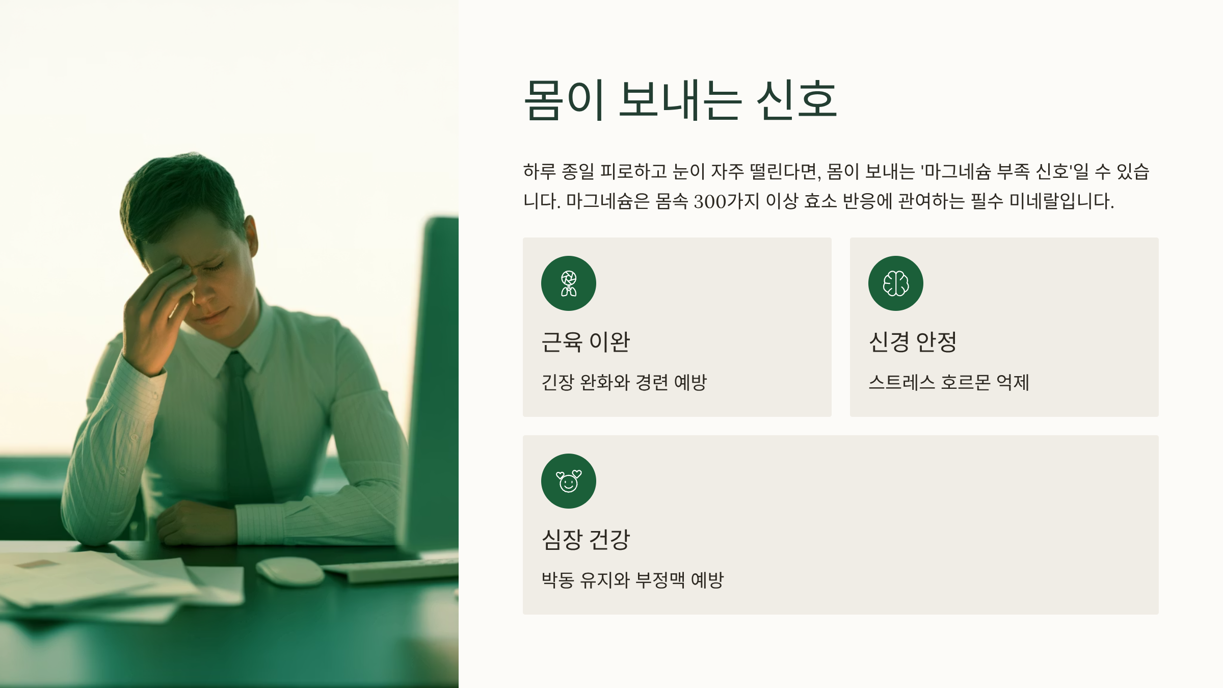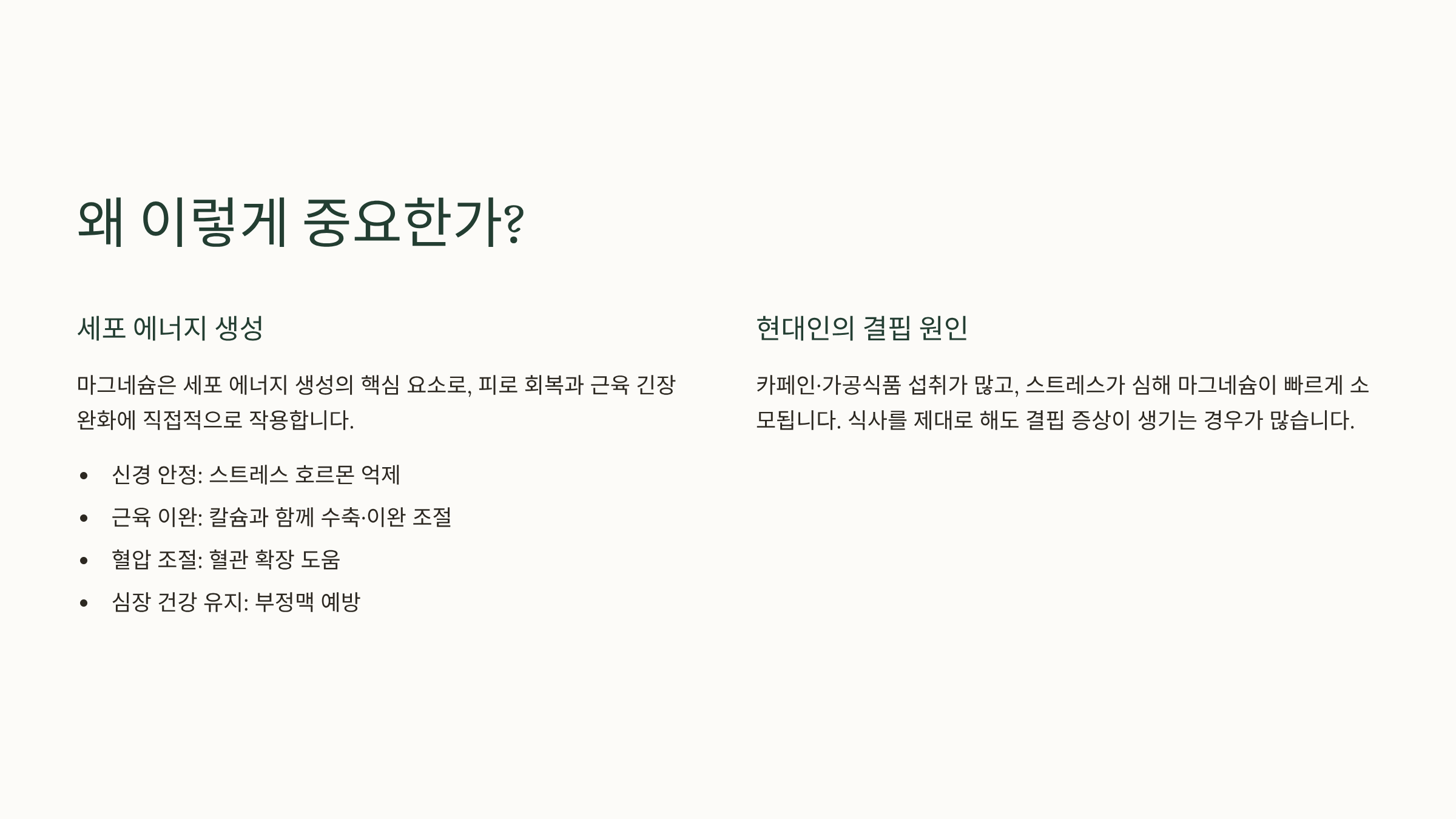 마그네슘은 몸속 300가지 이상 효소 반응에 관여하는 필수 미네랄로, 근육 이완·신경 안정·심장 박동 유지에 모두 필요합니다.