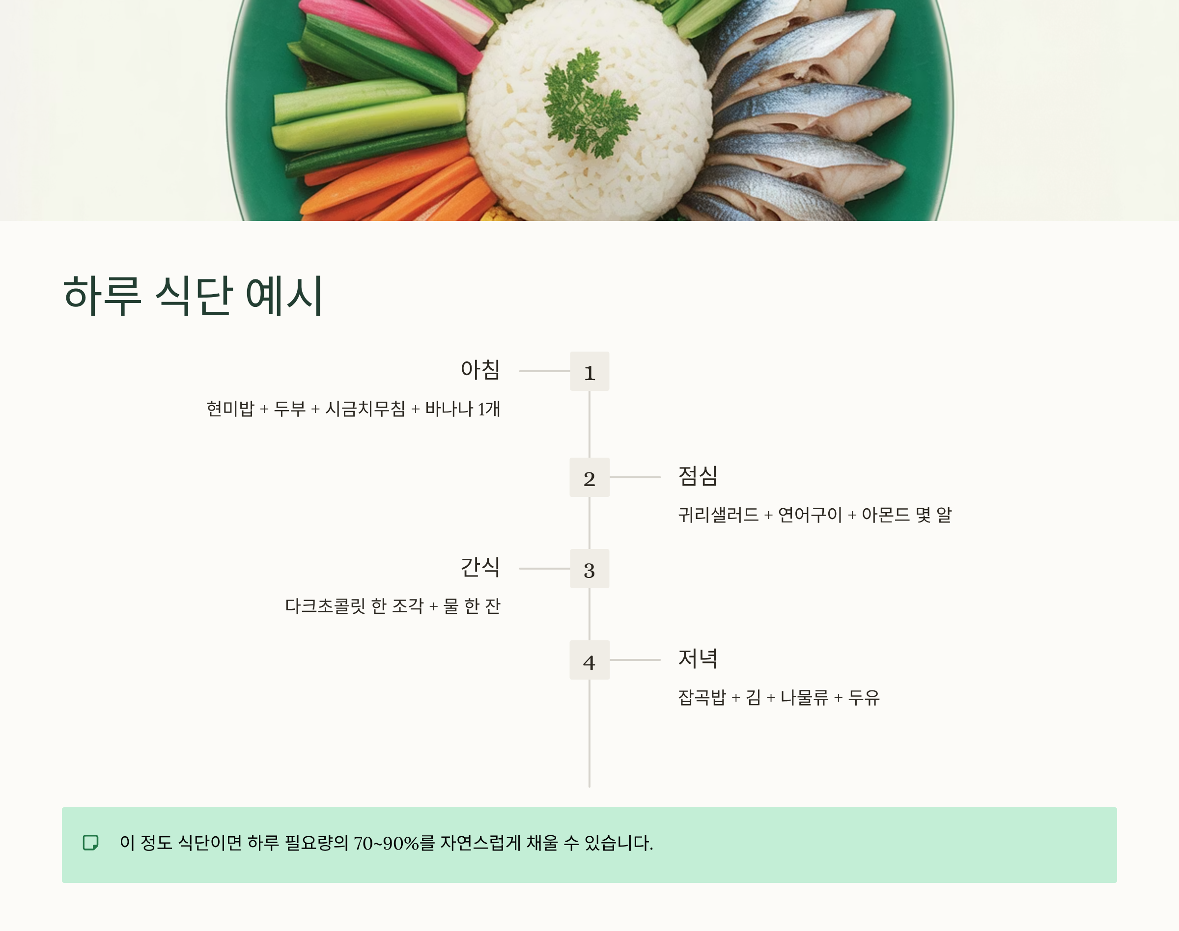 이 정도 식단이면 하루 필요량의 70~90%를 자연스럽게 채울 수 있습니다.