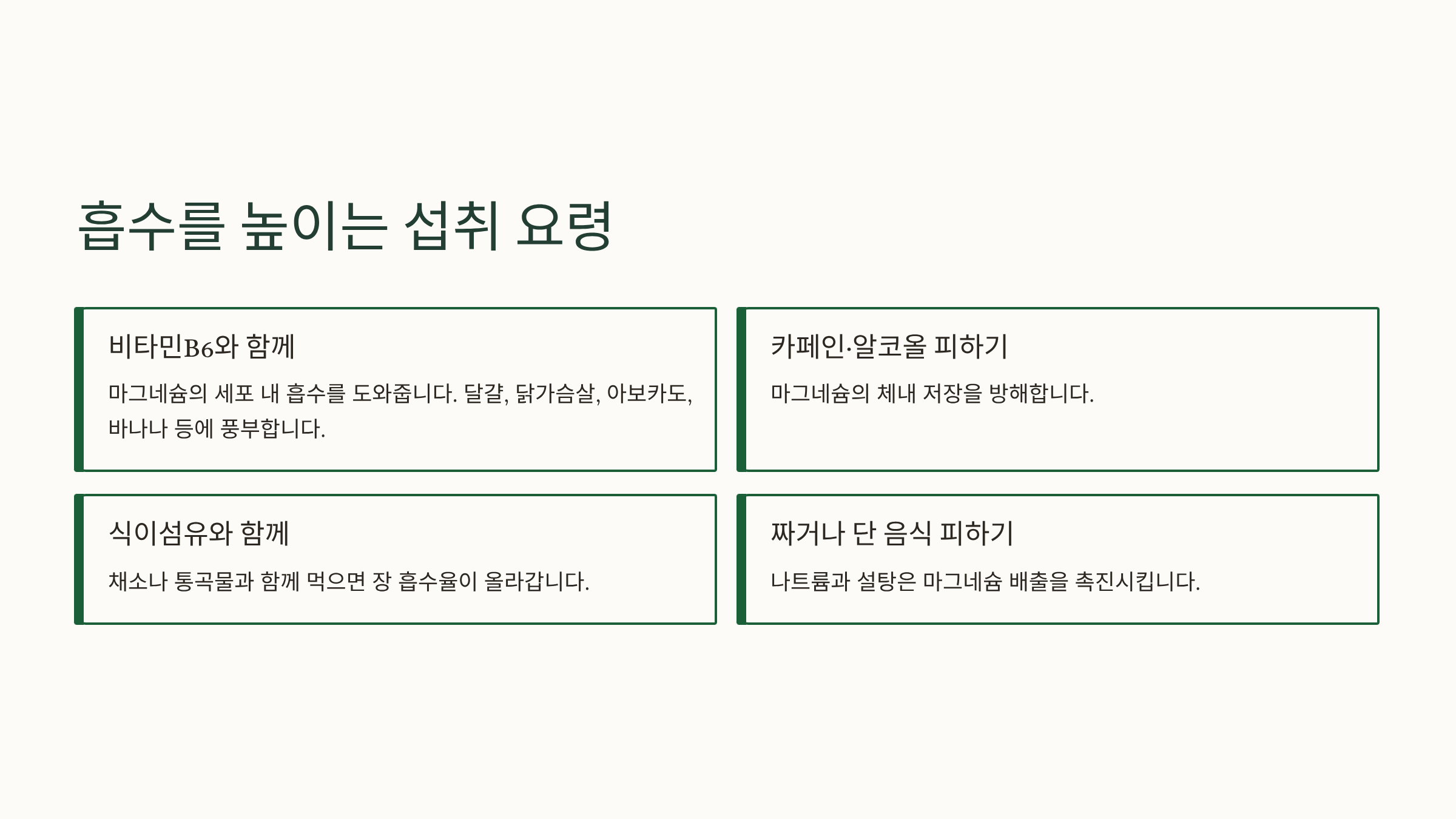 이번 글에서는 마그네슘이 풍부한 음식과 흡수율을 높이는 섭취법을 정리했습니다.