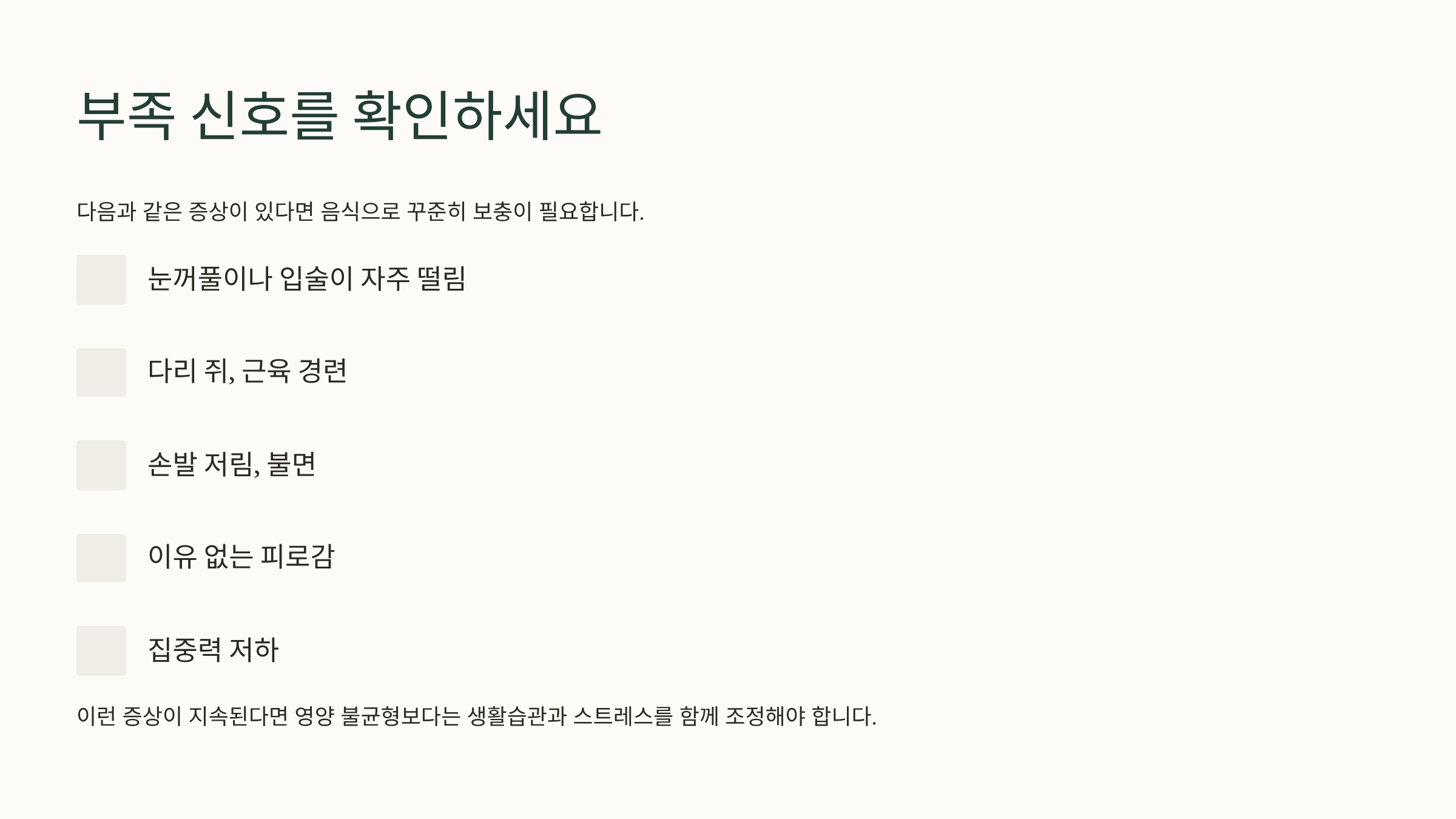이런 증상이 지속된다면 영양 불균형보다는 생활습관과 스트레스를 함께 조정해야 합니다.