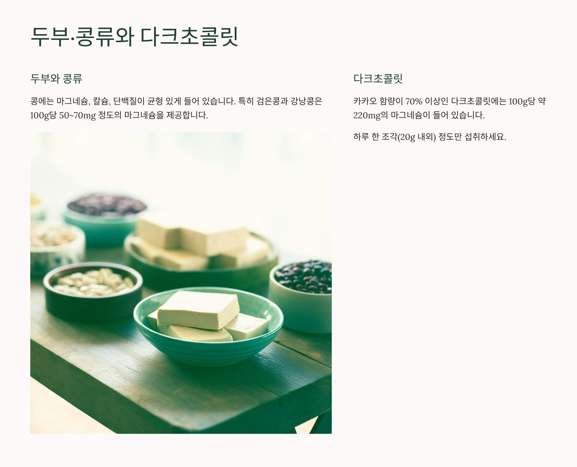 특히 검은콩과 강낭콩은 100g당 50~70mg 정도의 마그네슘을 제공합니다.