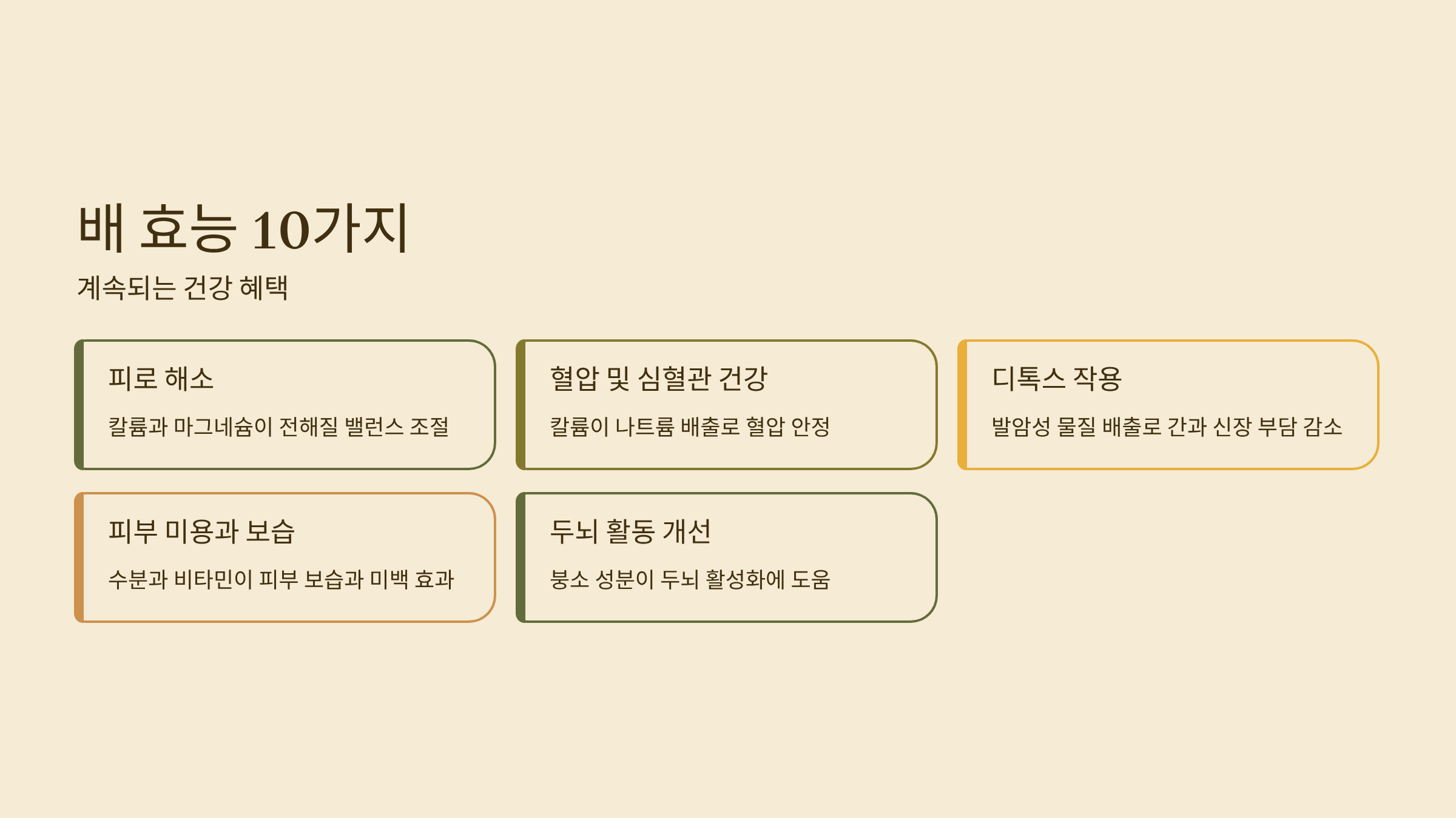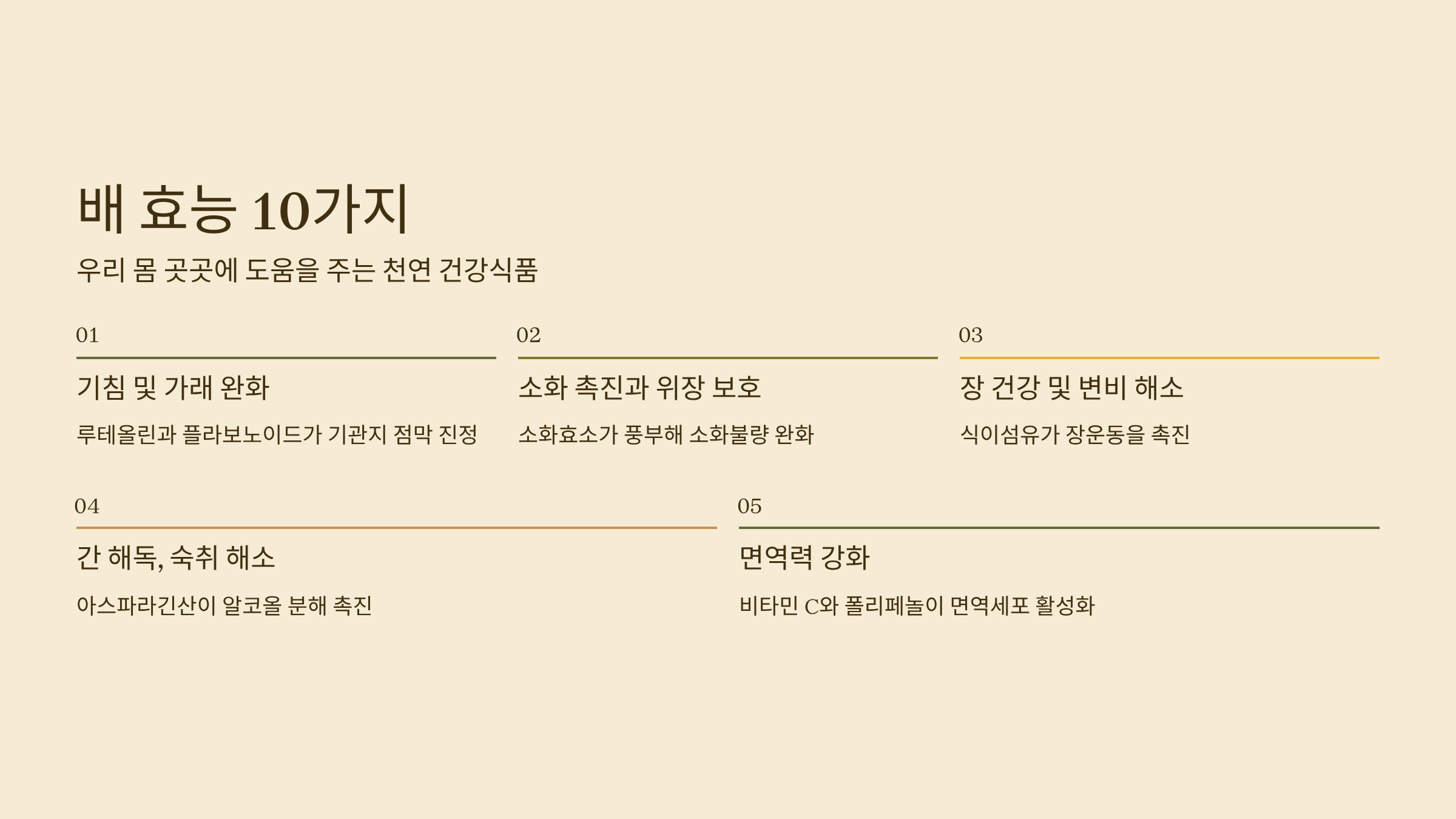 배는 기침이나 기관지 건강에서부터 디톡스, 피부 미용까지 우리 몸 곳곳에 다양한 효능을 발휘합니다. 대표적인 10가지는 다음과 같습니다.
