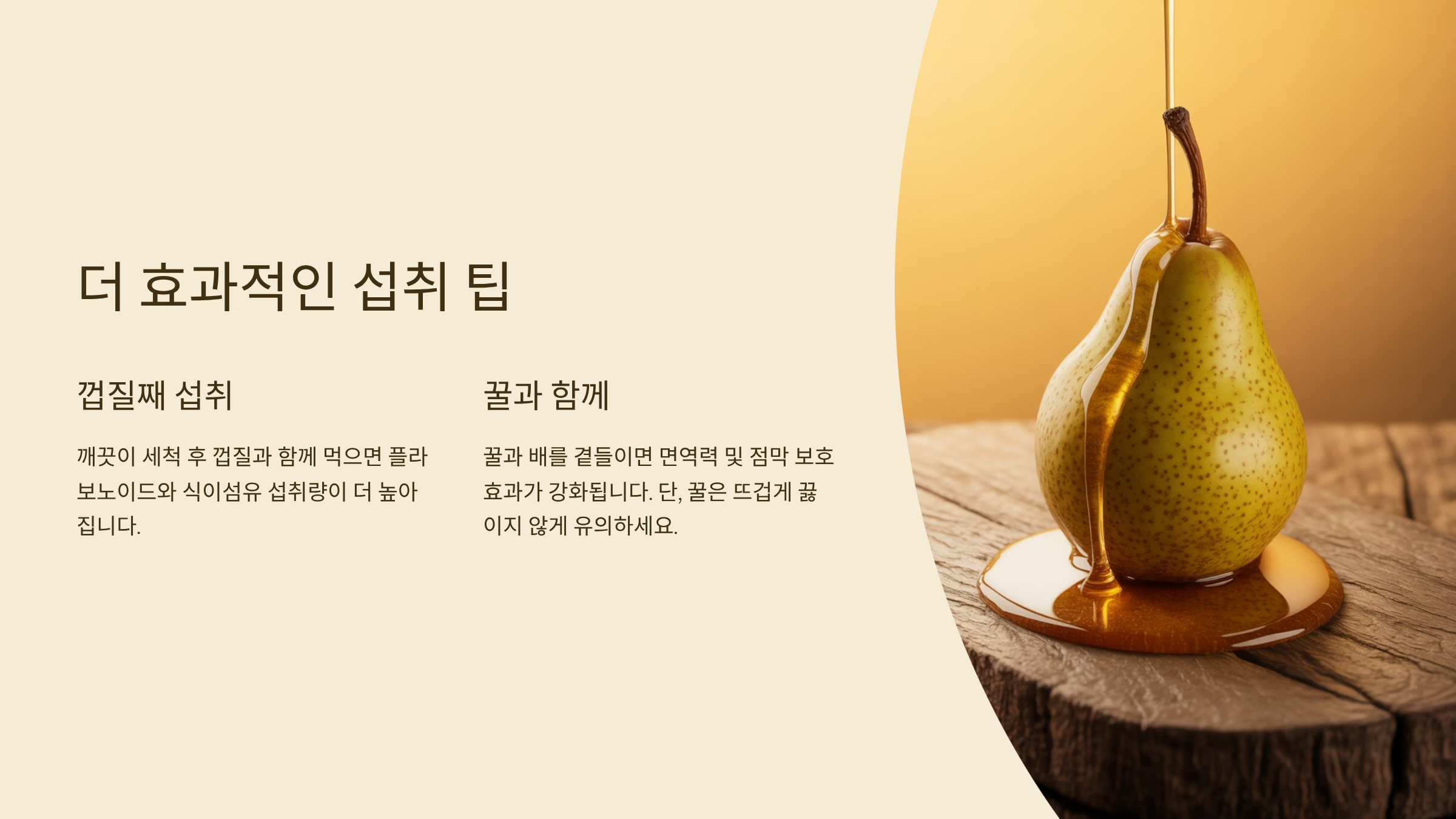 - 꿀과 함께: 꿀과 배를 곁들이면 면역력 및 점막 보호 효과가 강화됩니다. 단, 꿀은 뜨겁게 끓이지 않게 유의해야 합니다.