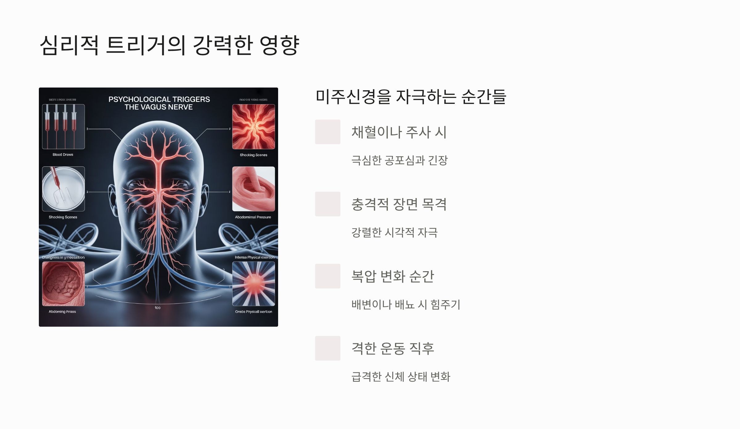 미주신경성 실신은 아무 이유 없이 발생하기보다, 신경계를 자극하는 특정 트리거(유발 요인)가 존재할 때가 많습니다.