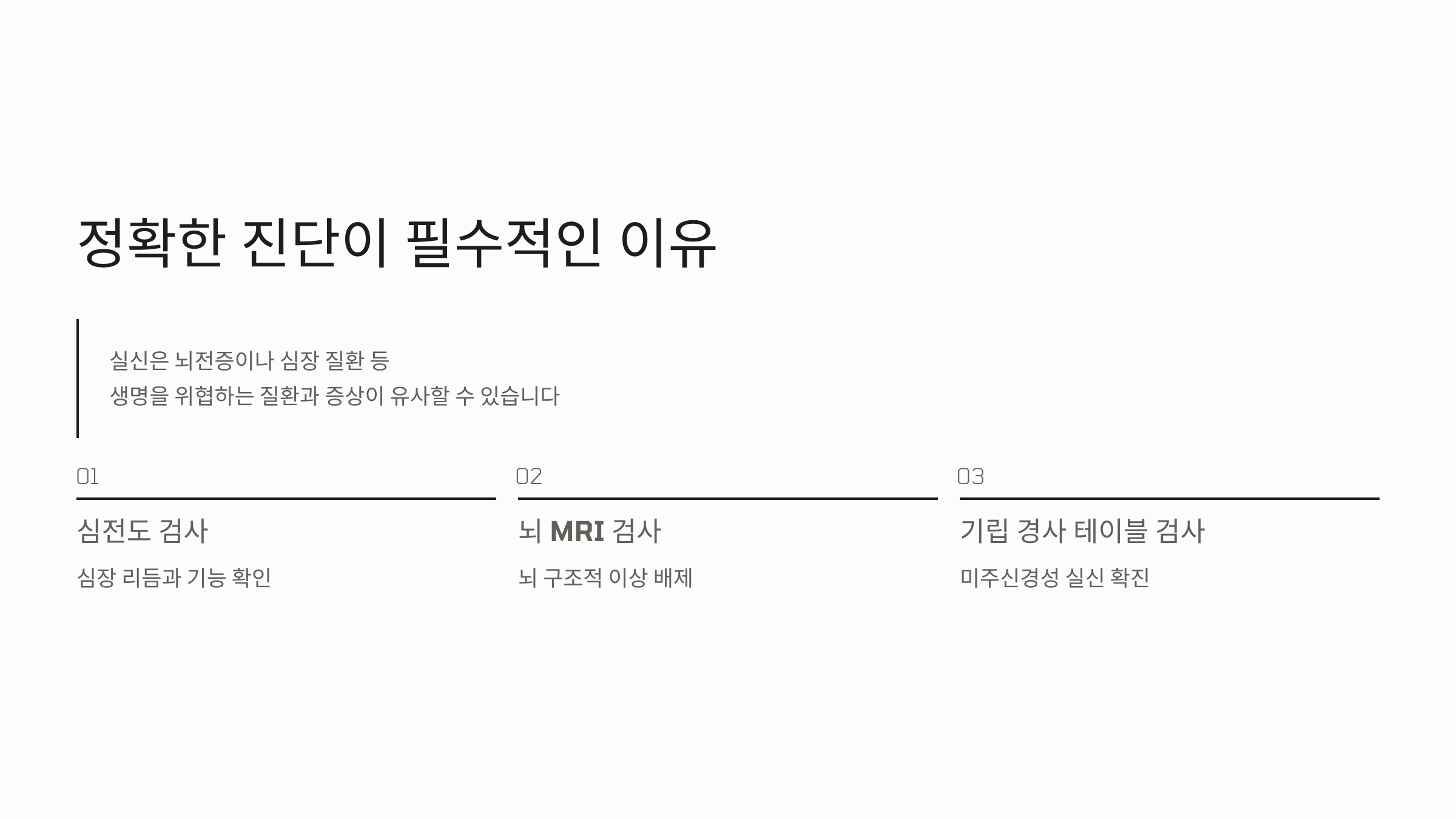 실신은 뇌전증이나 심장 질환 등 생명을 위협하는 다른 질환과 증상이 유사할 수 있으므로 정확한 진단이 필수적입니다. 병원에서는 심전도 검사, 뇌 MRI 등을 통해 다른 기저 질환이 없음을 먼저 확인합니다.