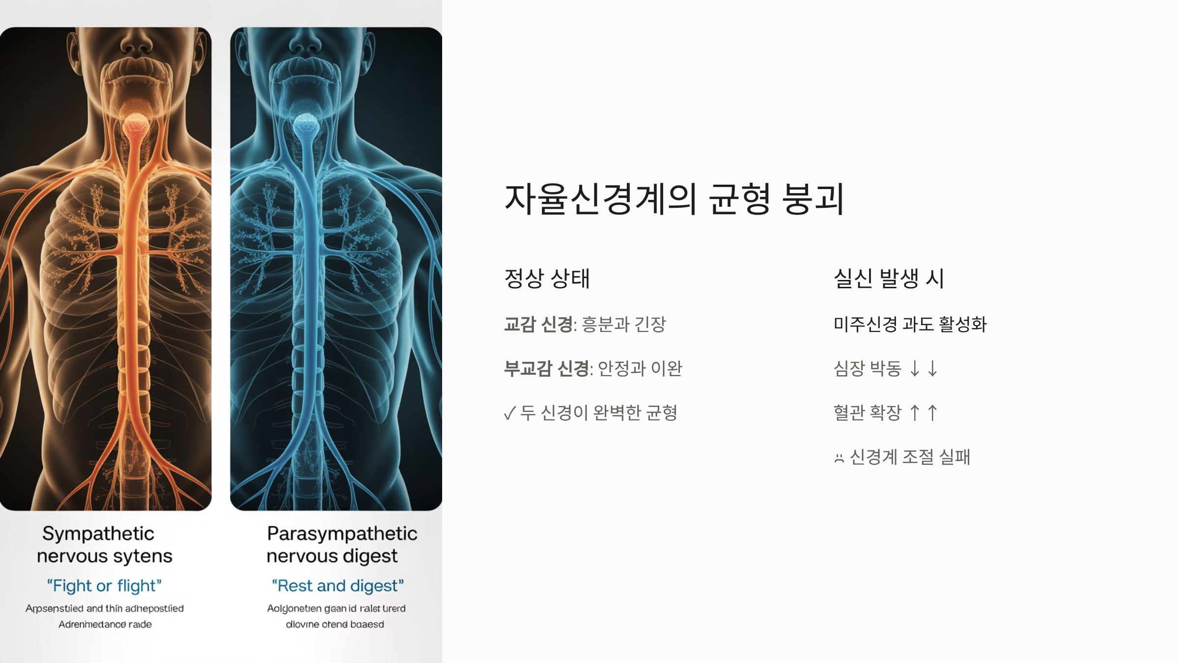의학적으로 미주신경성 실신은 신경 심장성 실신이라고도 불립니다. 우리 몸에는 혈압과 맥박을 조절하는 자율신경계가 있는데, 이는 흥분할 때 작용하는 교감 신경과 안정을 취할 때 작용하는 부교감 신경(미주신경)으로 나뉩니다. 정상적인 상태에서는 이 두 신경이 균형을 이루지만, 극심한 신체적 또는 정신적 스트레스를 받게 되면 미주신경이 과도하게 활성화되는 오작동이 발생합니다.