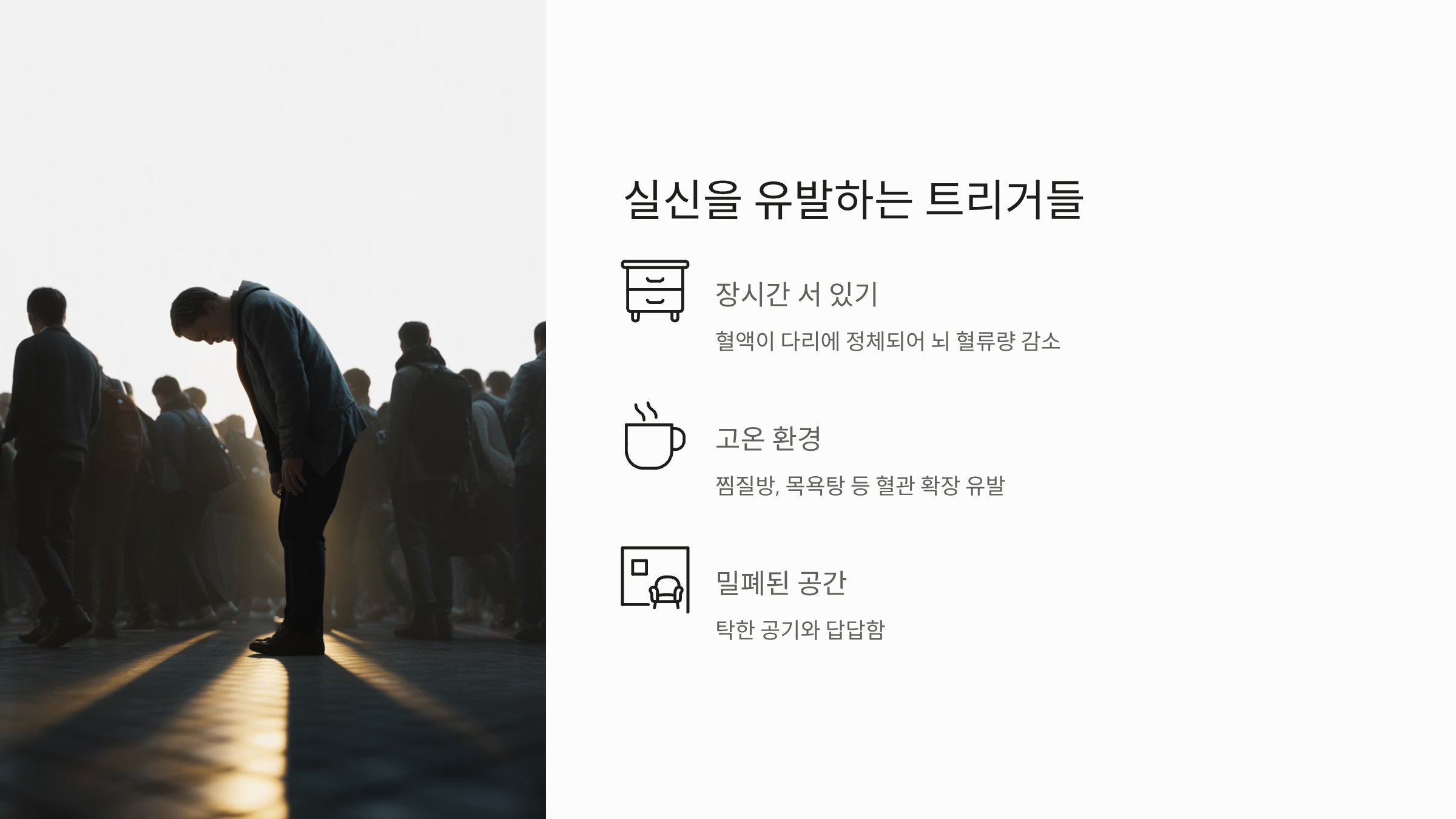가장 흔한 원인은 장시간 서 있는 것입니다. 움직이지 않고 오래 서 있으면 혈액이 다리에 정체되어 뇌 혈류량이 감소하기 쉽습니다. 또한, 탁한 공기가 가득한 밀폐된 공간, 찜질방이나 목욕탕 같은 고온 환경도 혈관을 확장시켜 실신을 유발합니다.