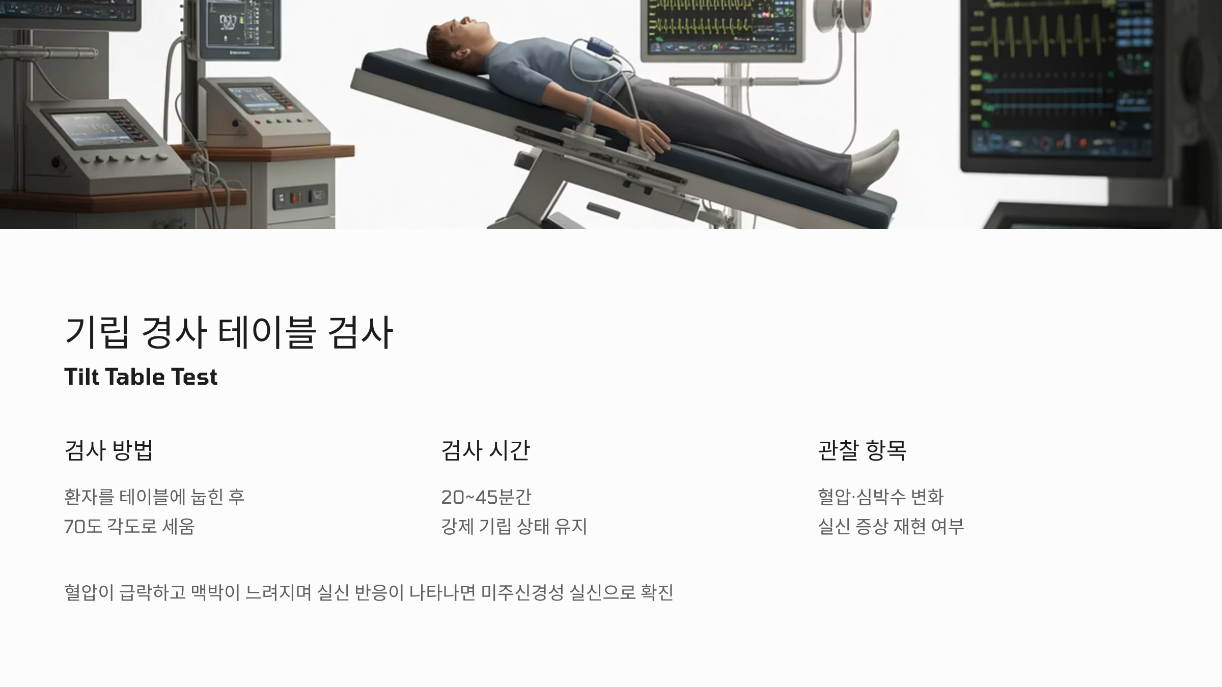 미주신경성 실신을 확진하는 가장 대표적인 검사는 기립 경사 테이블 검사입니다. 환자를 테이블에 눕히고 테이블의 각도를 70도 정도로 세워 강제로 기립 상태를 만듭니다. 약 20분에서 45분간 이 상태를 유지하면서 혈압과 심박수의 변화를 관찰하고, 필요시 약물을 투여하여 실신 증상이 재현되는지 확인합니다. 이 과정에서 혈압이 뚝 떨어지거나 맥박이 느려지며 실신 반응을 보인다면 미주신경성 실신으로 진단하게 됩니다.