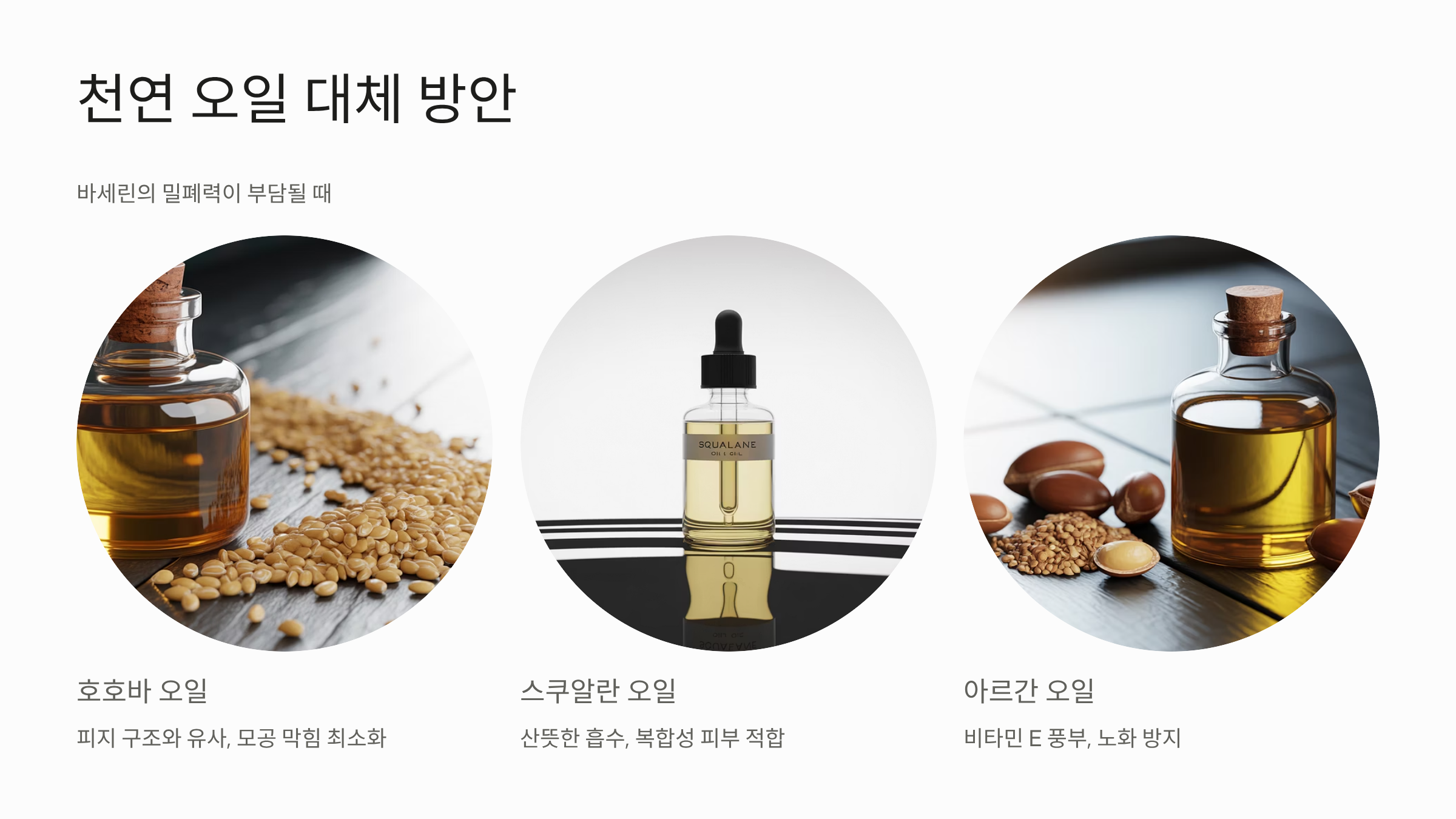 - 스쿠알란 오일 (산뜻한 마무리): 올리브에서 추출되는 스쿠알란 오일은 산뜻하게 흡수되면서도 피부의 유분막을 보강하는 효과가 있습니다. 유분감이 부담스러운 복합성 피부에 적합하며, 수분 크림에 한두 방울 섞어 주름 부위에 바르면 좋습니다.