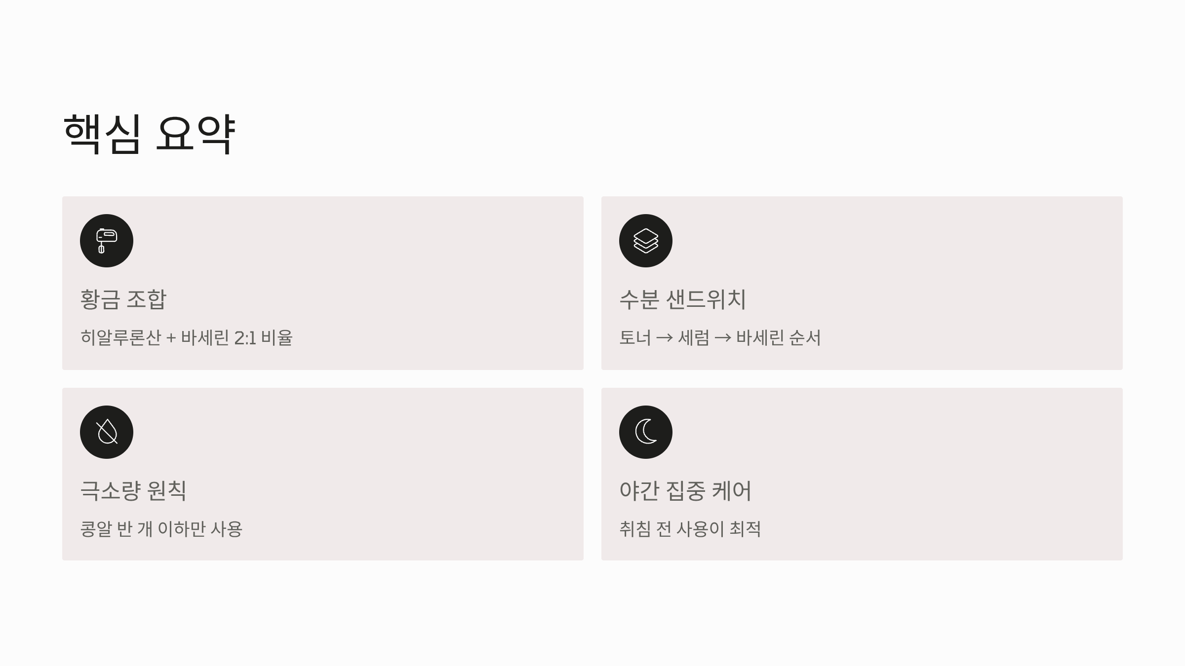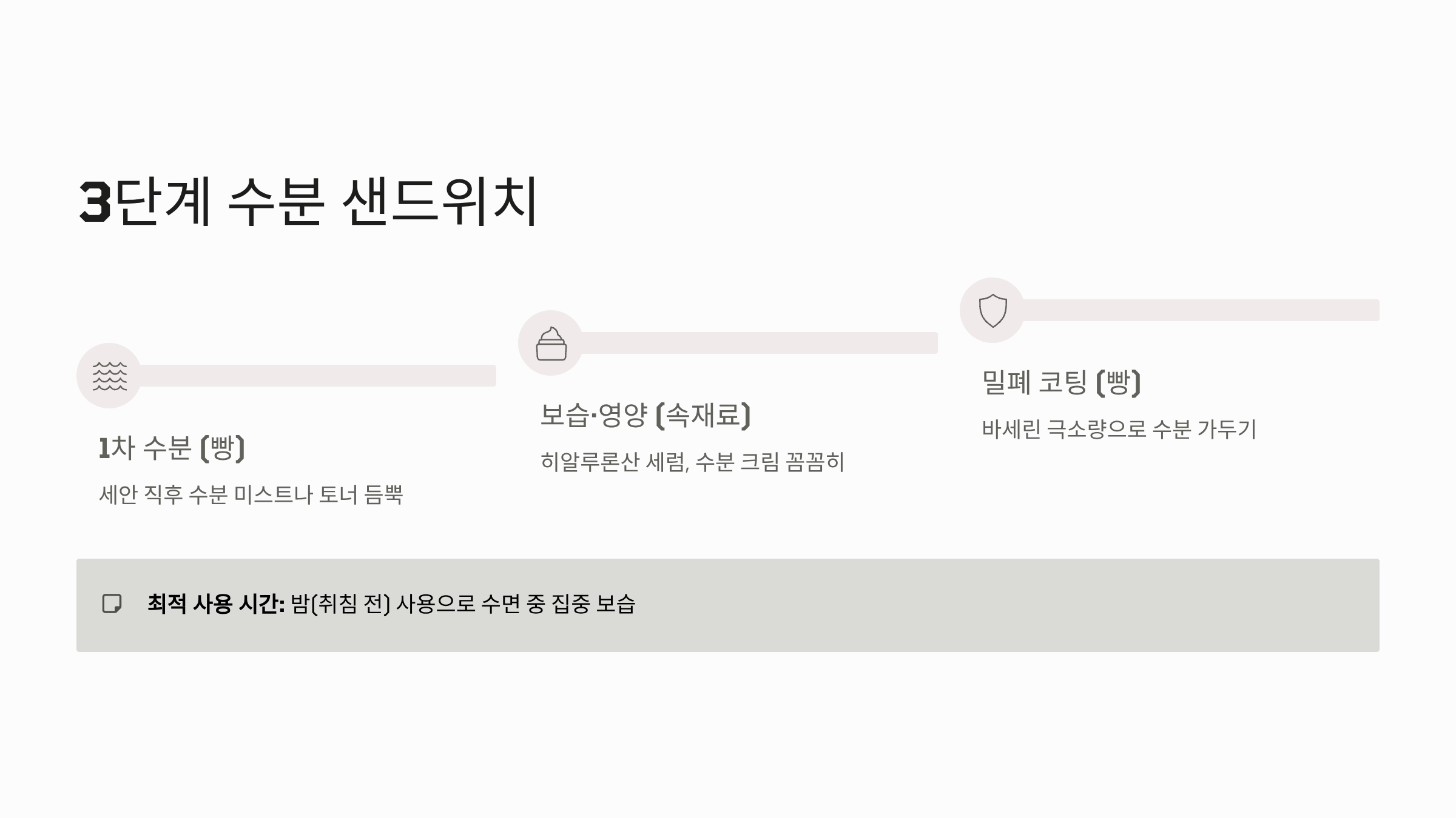 - 보습/영양 (속재료): 히알루론산 세럼, 수분 크림 등 평소 사용하는 보습제를 꼼꼼히 바릅니다.