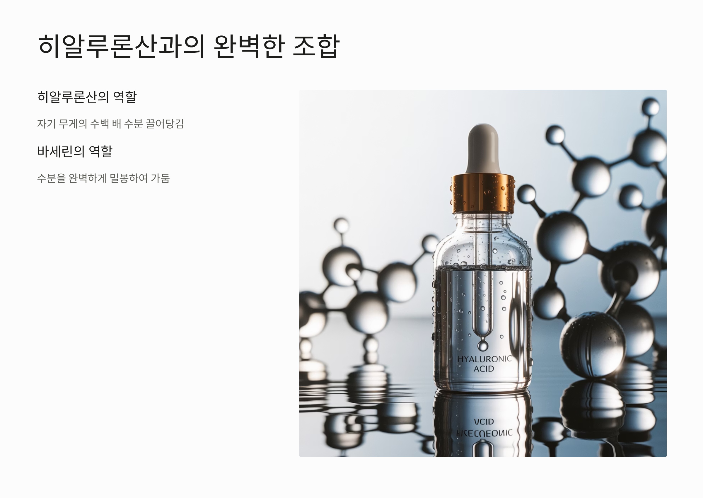 - 히알루론산의 역할: 히알루론산은 자기 무게의 수백 배에 달하는 수분을 끌어당기는 성분입니다. 피부에 수분을 집중적으로 공급하고 유지하는 역할을 합니다.