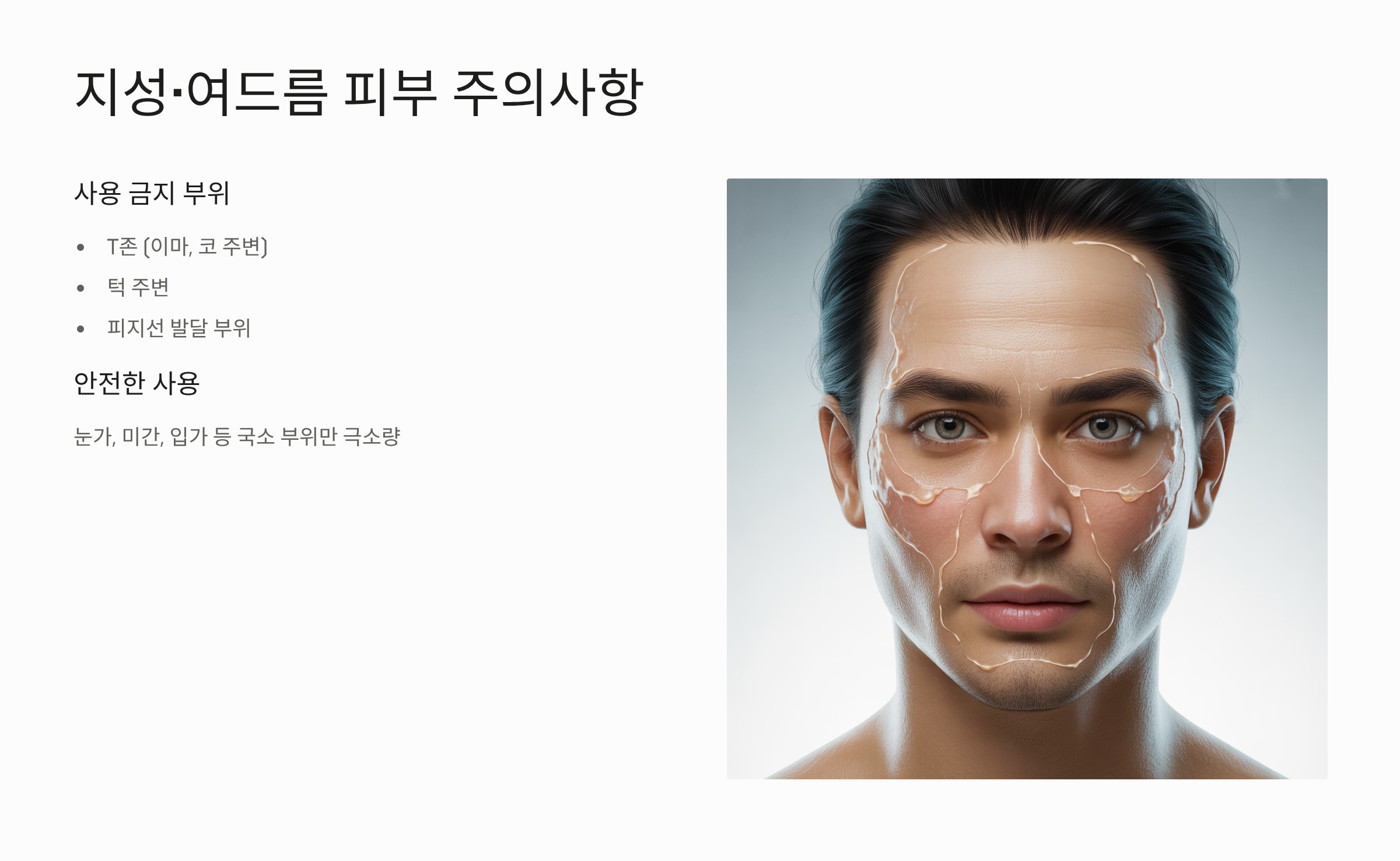 - 안전한 국소 사용: 지성 피부라도 건조함이 심해 잔주름이 생기기 쉬운 눈가, 미간, 입가 주변 등 피지선 활동이 비교적 적은 국소 부위에 아주 소량만 사용해야 합니다.