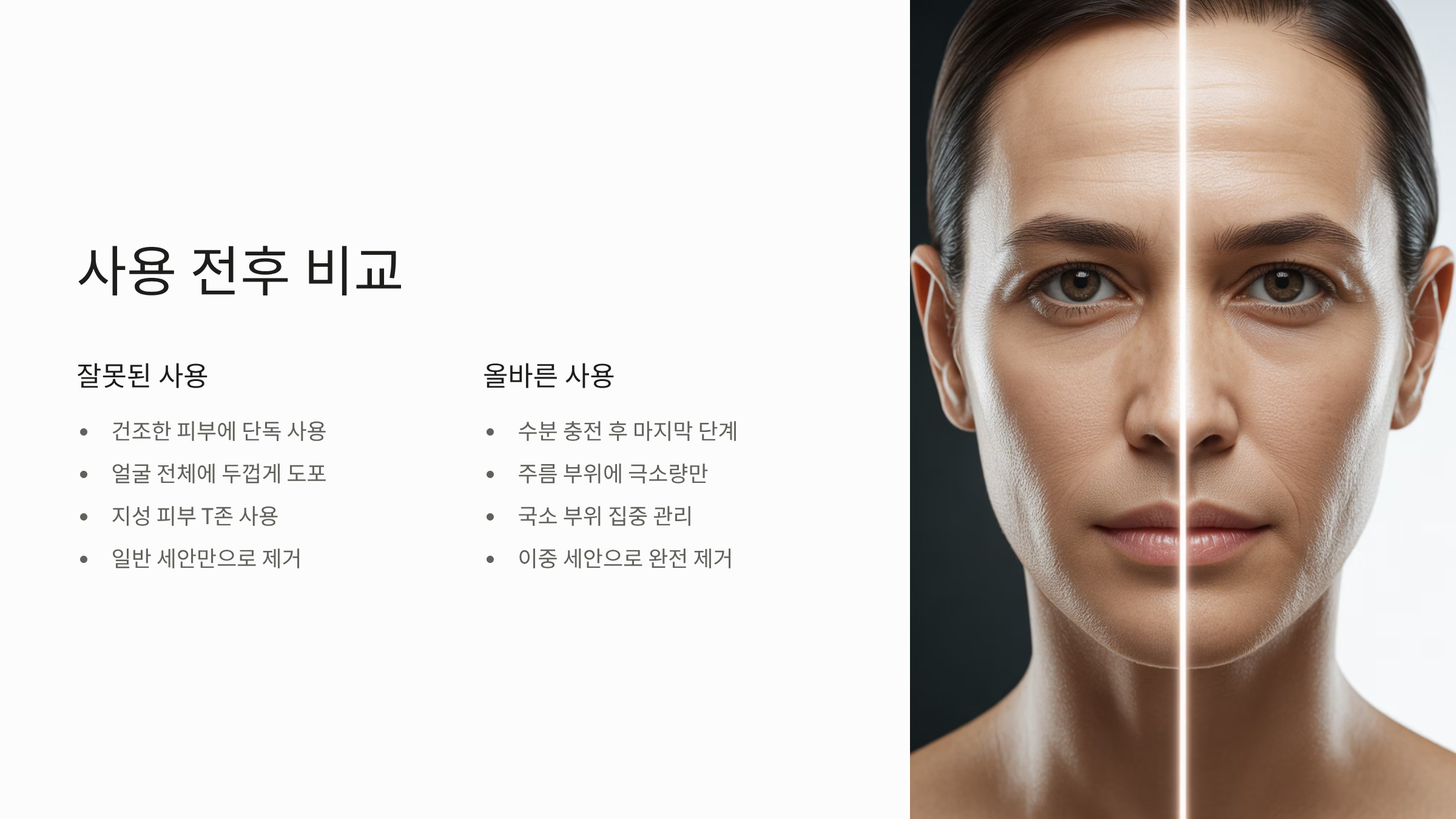 - 도포: 눈가, 팔자 주름 등 주름 부위에만 얇게 펴 바르고, 손가락으로 톡톡 두드려 흡수시킵니다.