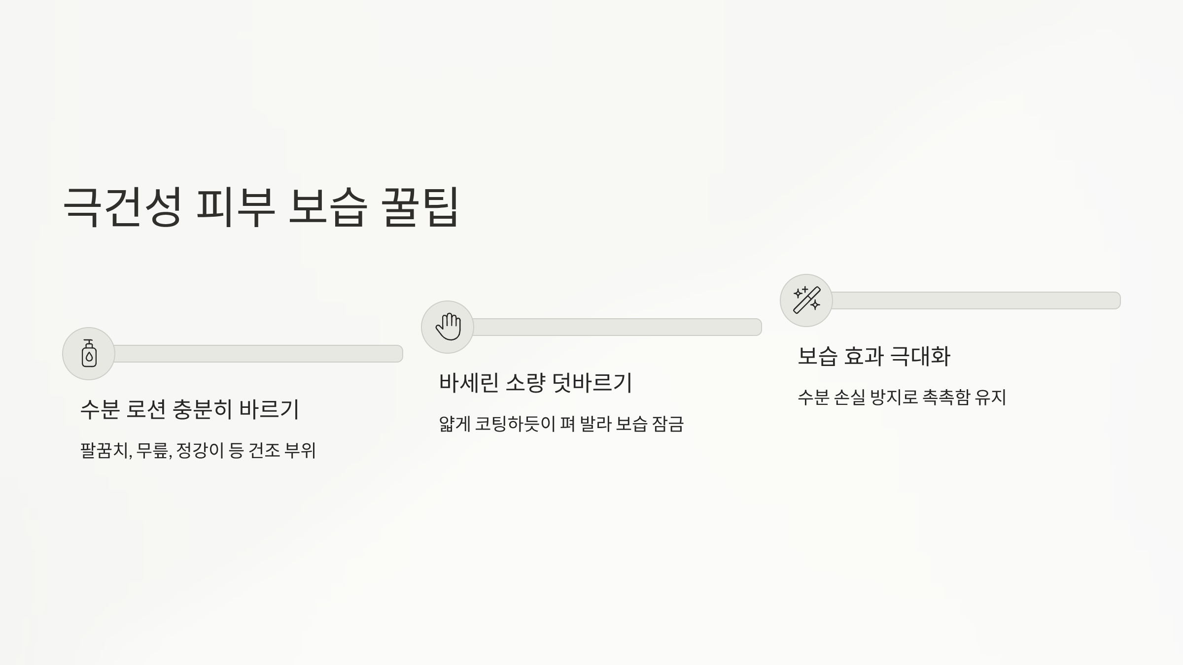 - 바세린 샌드위치 기법: 보습제를 바르는 순서를 '수분층-유분층-수분층'처럼 겹겹이 쌓아 보습 효과를 높이는 방법입니다.