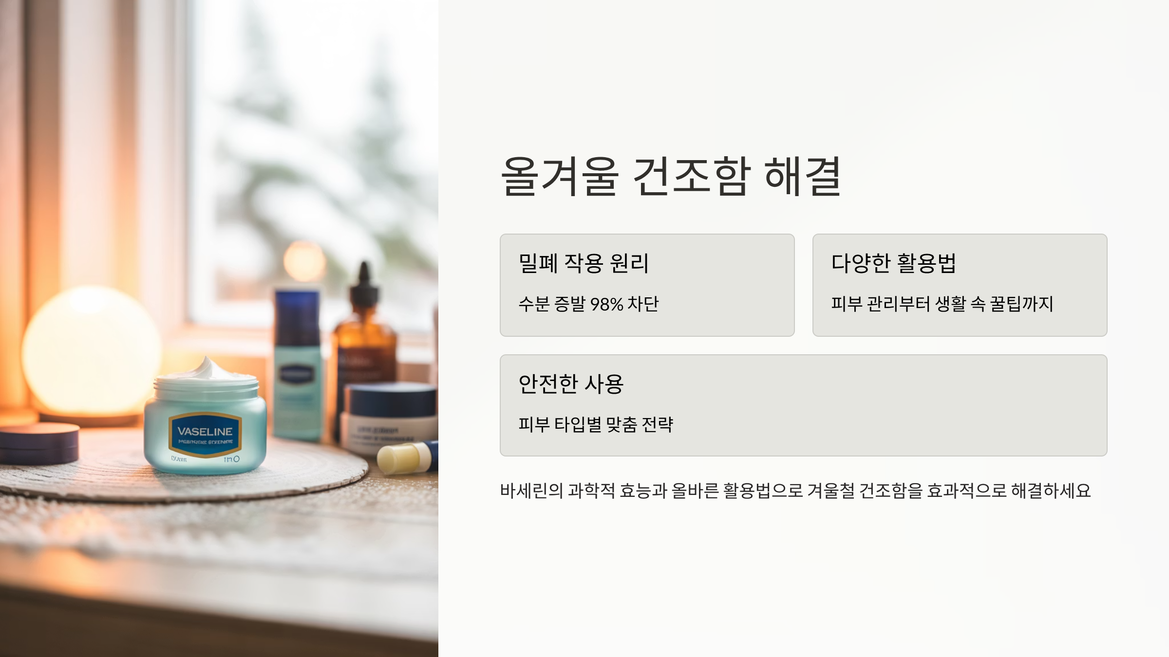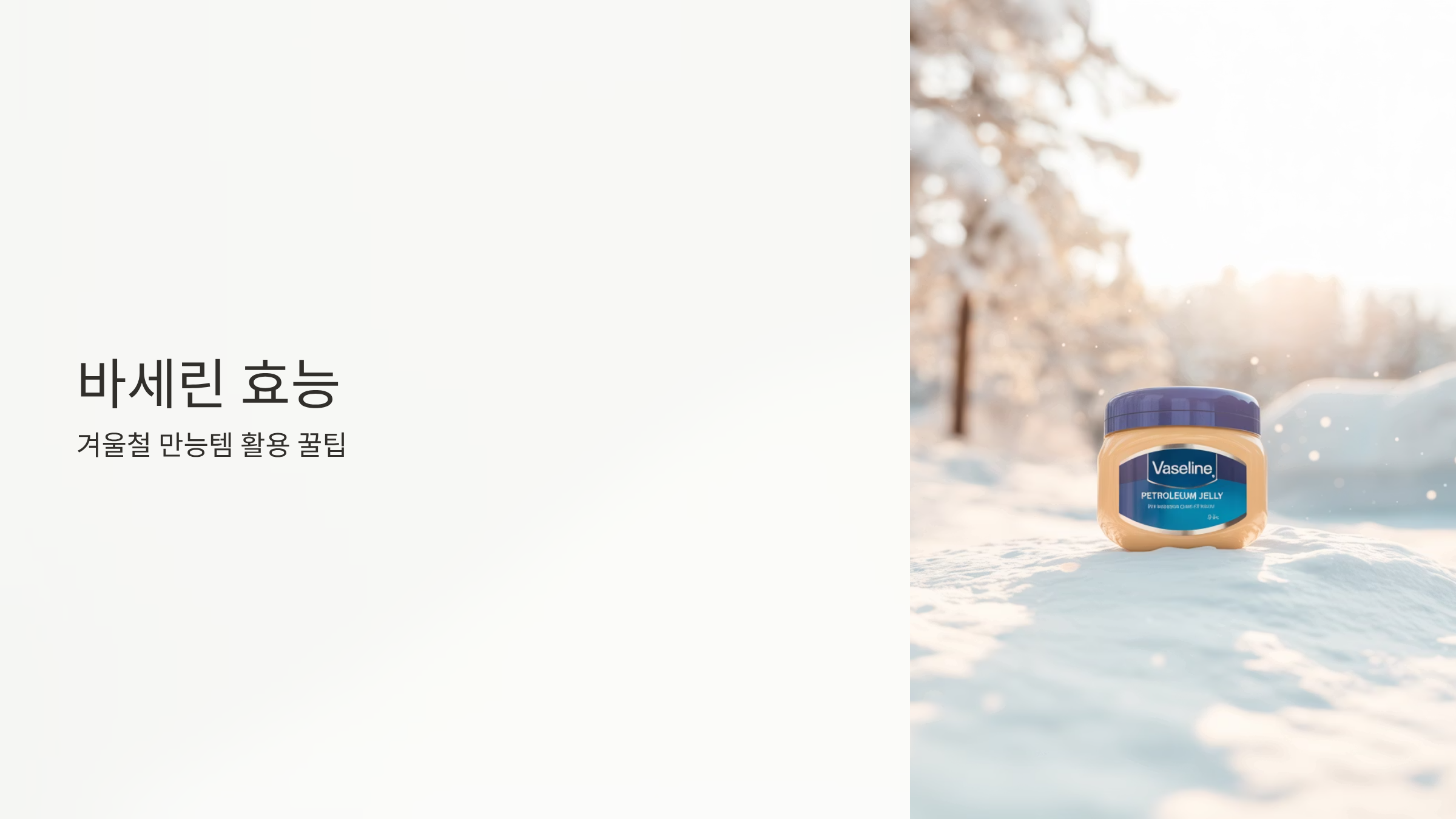 이 글에서 제시된 바세린의 과학적 효능과 올바른 활용 꿀팁을 통해, 올겨울 건조함과 생활 속 불편함을 효과적으로 해결하시기를 바랍니다.