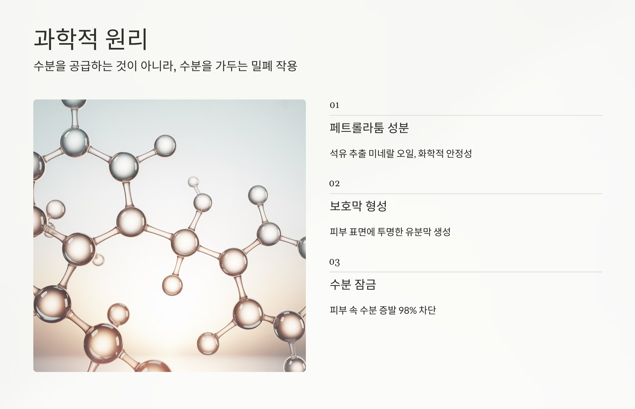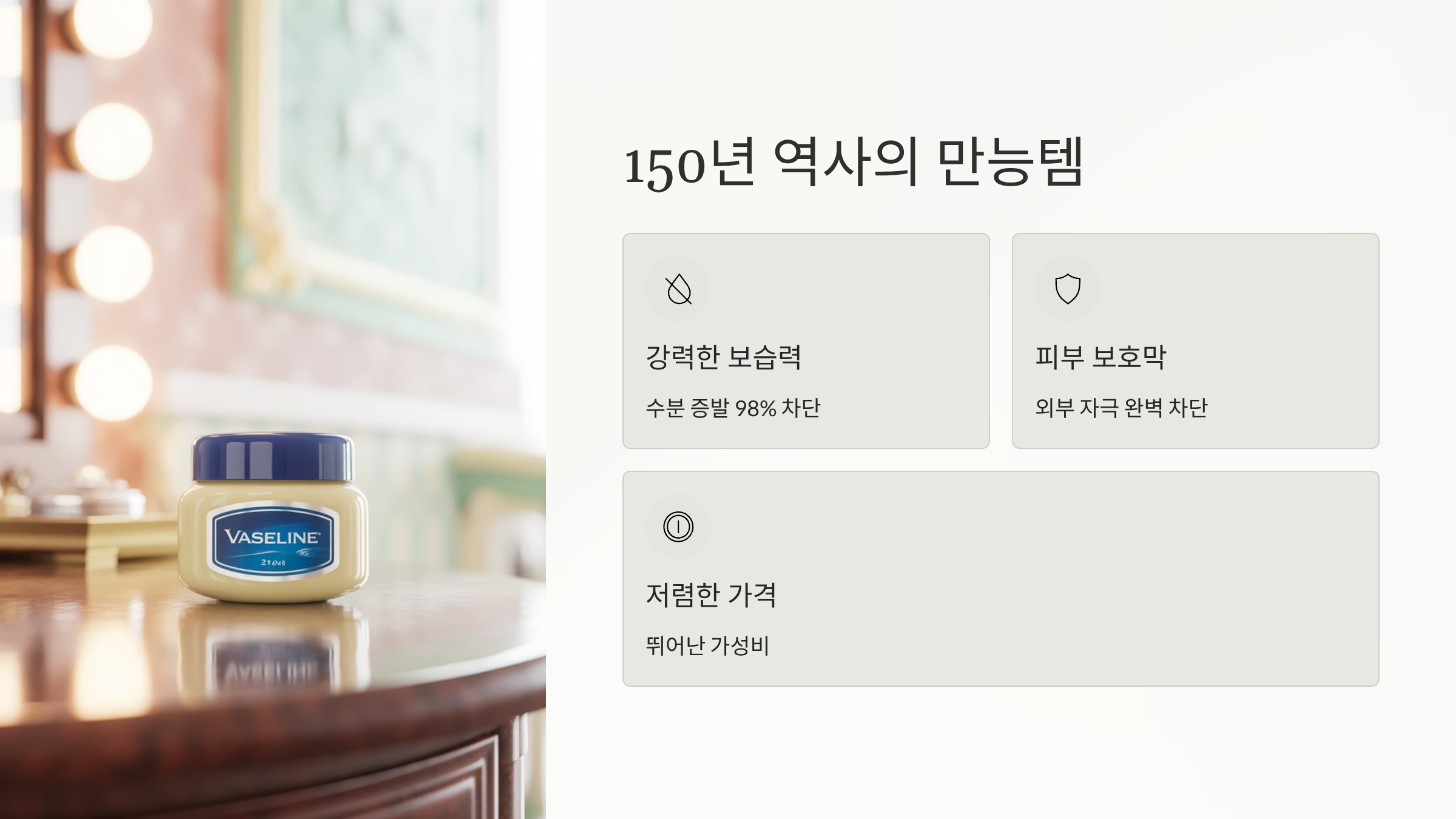 바세린이 강력한 보습력을 가지고 '만능템'으로 불리는 것은 수분을 공급하는 것이 아니라, 수분을 가두는 '밀폐 작용'과 화학적 안정성 때문입니다.