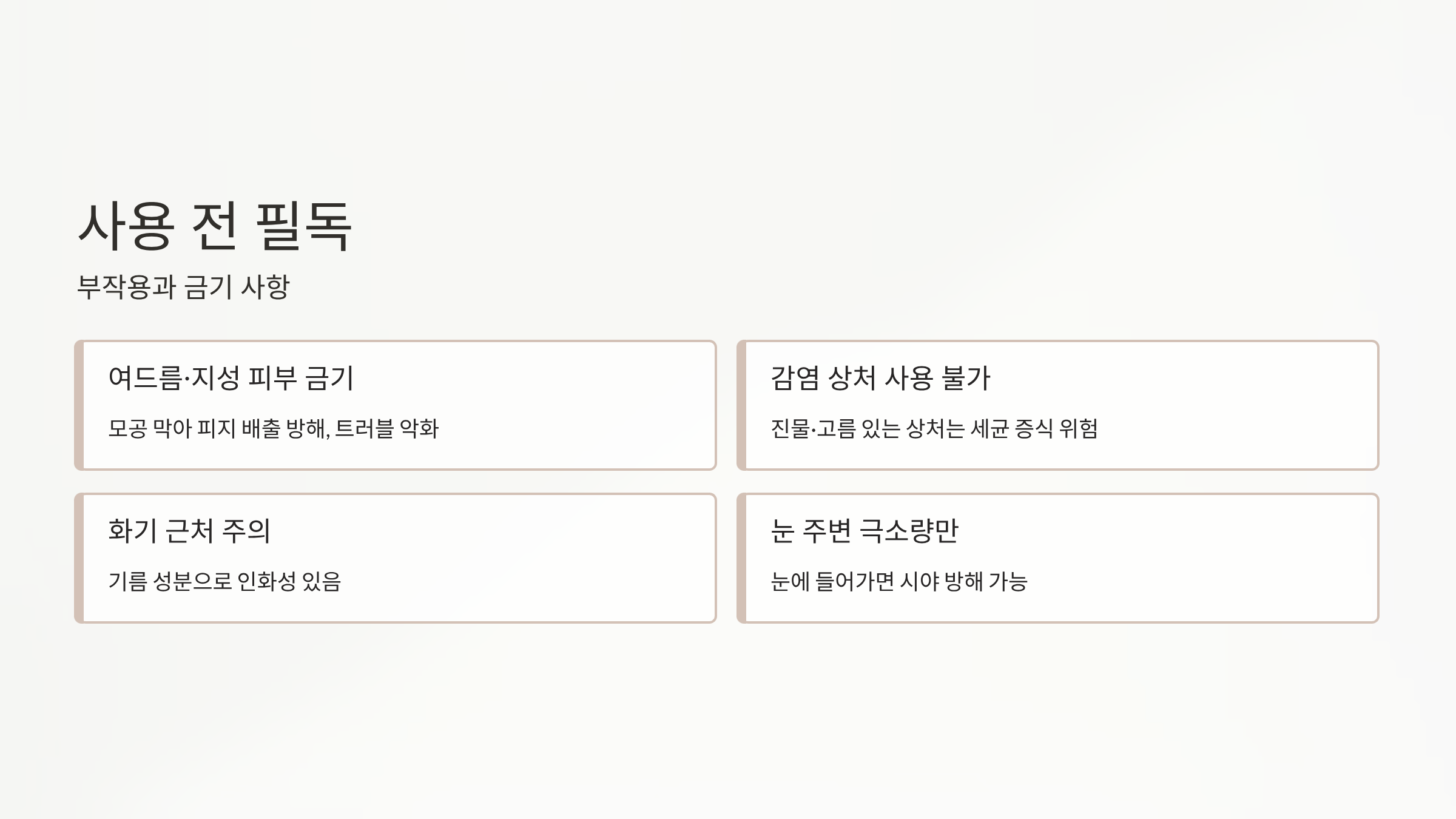 - 여드름 및 지성 피부 사용 금기: 바세린은 강력한 밀폐막을 형성하여 피지 분비가 활발한 지성 피부나 여드름이 난 부위에 사용하면 모공을 막아 피지 배출을 방해합니다. 이는 여드름, 뾰루지 등 피부 트러블을 악화시키는 주요 원인이 됩니다. 얼굴 전체 사용은 절대 피해야 합니다.