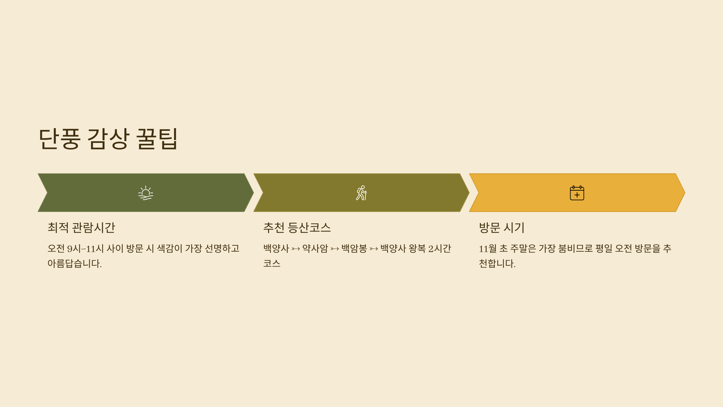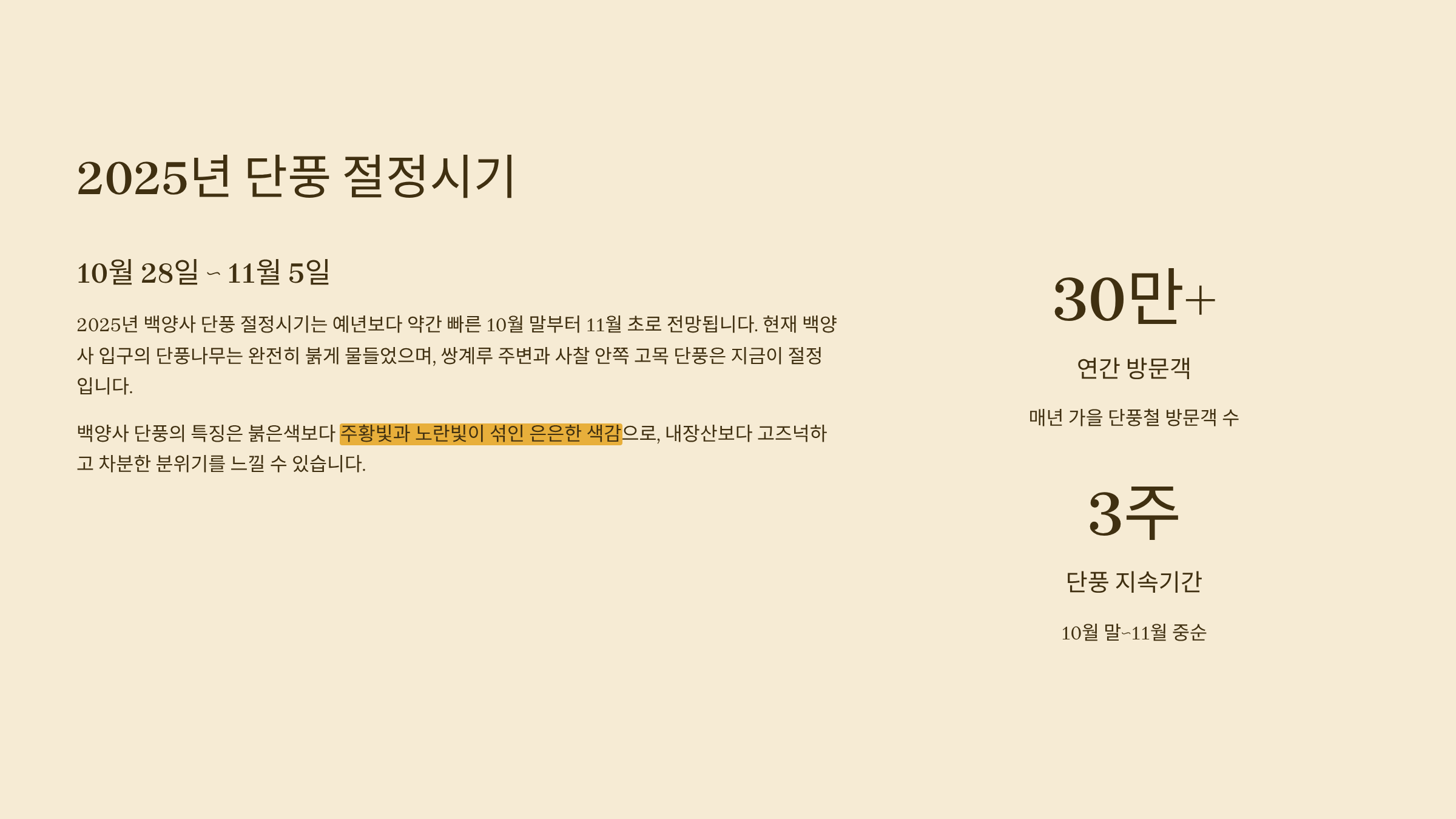 - 단풍 지속 기간: 10월 말~11월 중순까지 약 3주간