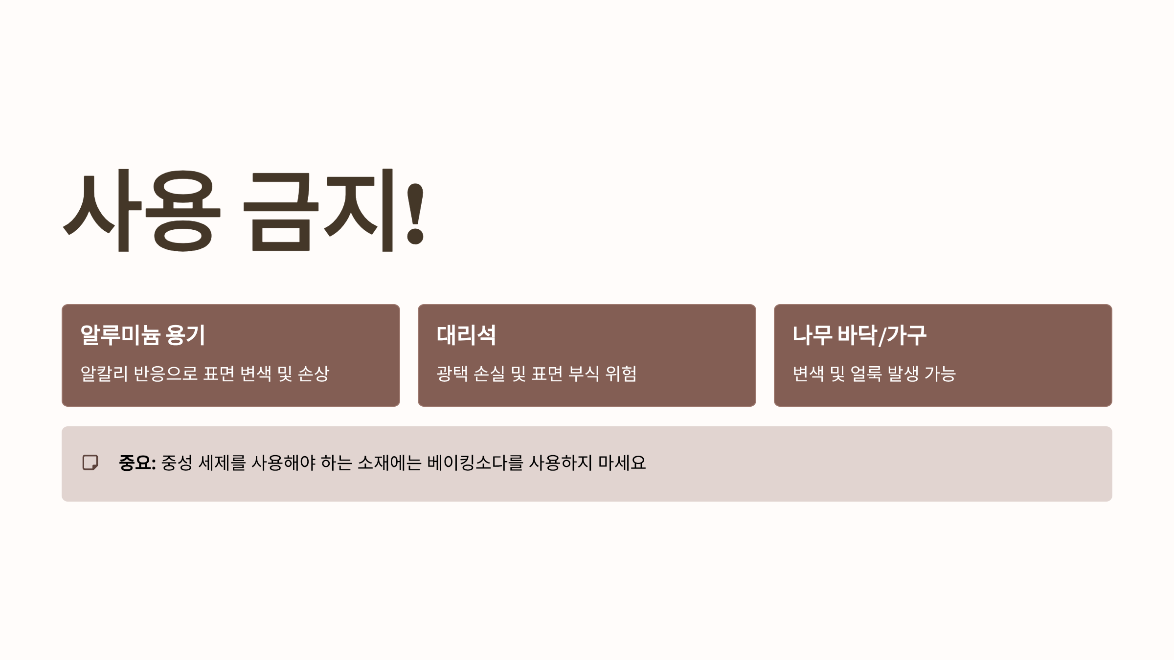 베이킹소다는 만능 세제지만, 특정 소재나 환경에서는 변색되거나 손상을 줄 수 있으므로 주의가 필요합니다.