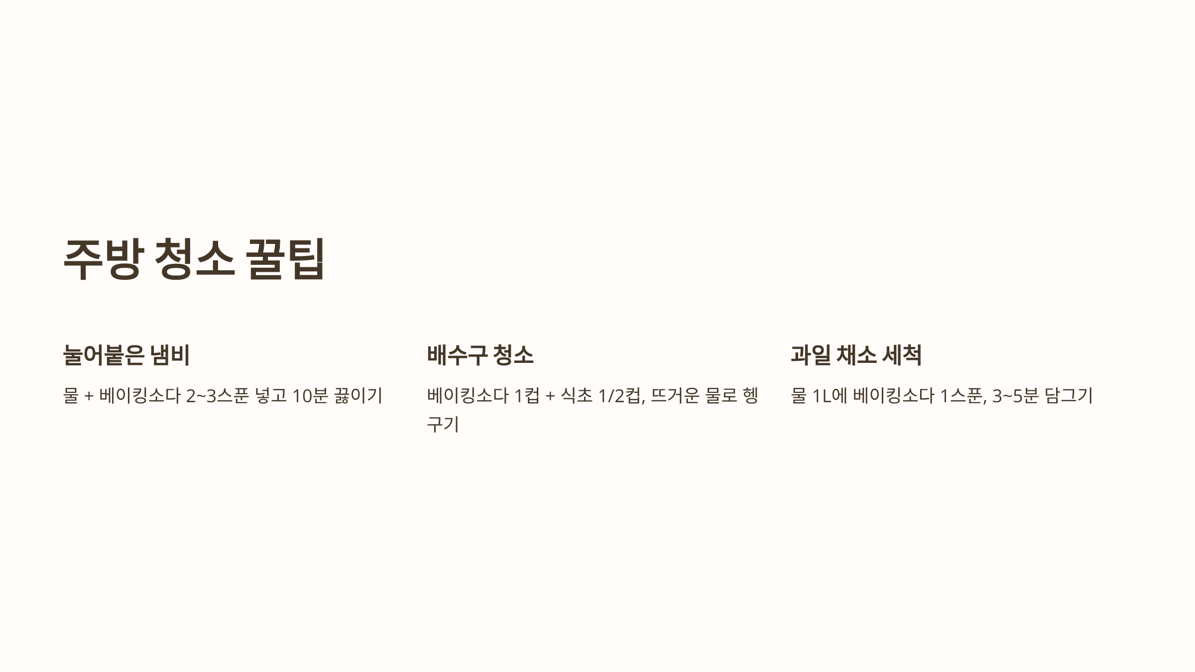| 눌어붙은 냄비/프라이팬 | 물을 채우고 베이킹소다 2~3스푼을 넣고 10분간 끓인 후 부드러운 수세미로 닦아낸다. | 눌어붙은 음식물 찌꺼기 및 탄 자국을 쉽게 불려 제거한다. |