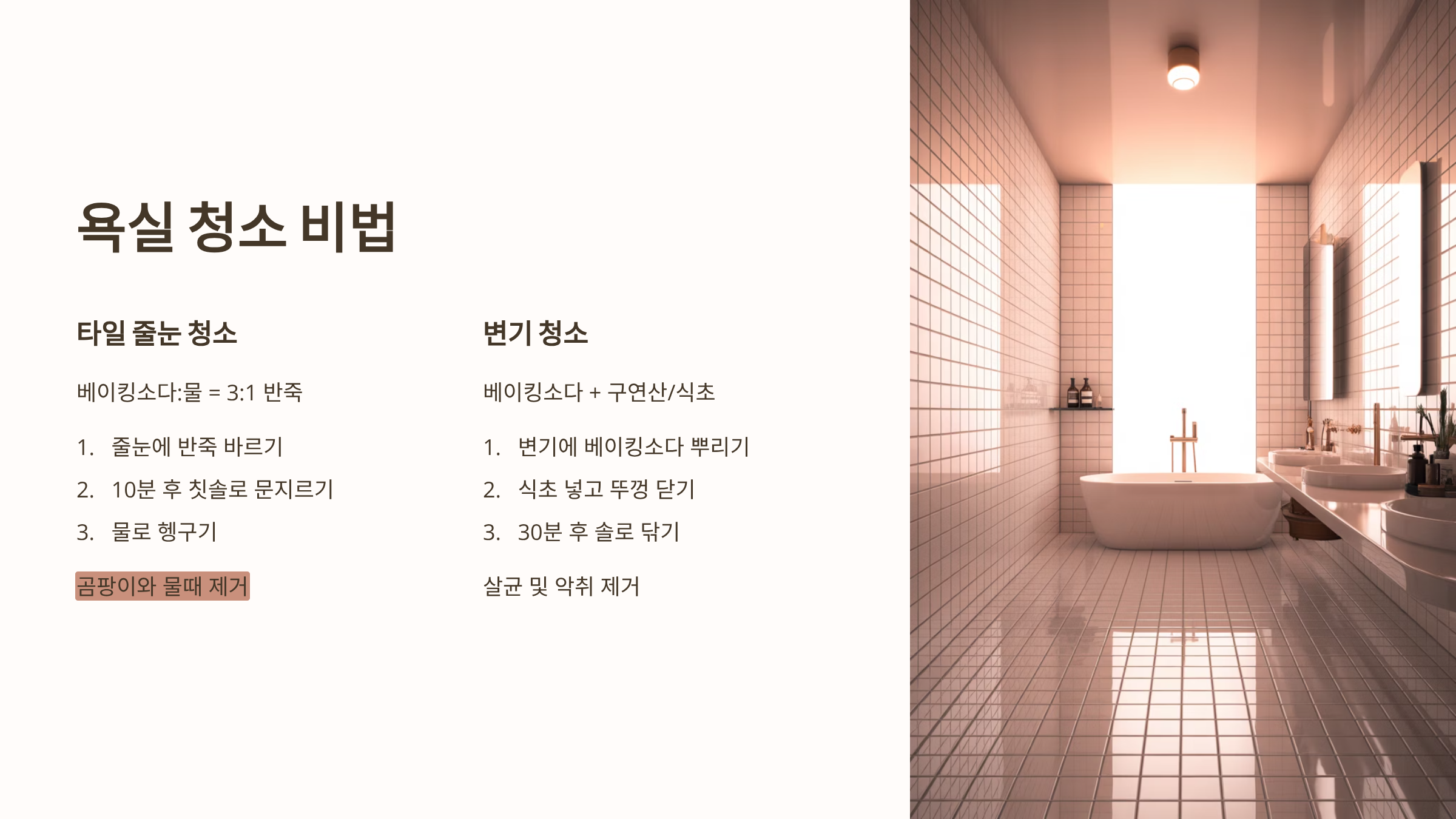 습기가 많고 물때와 곰팡이가 생기기 쉬운 욕실 청소에 베이킹소다를 사용하는 노하우입니다.