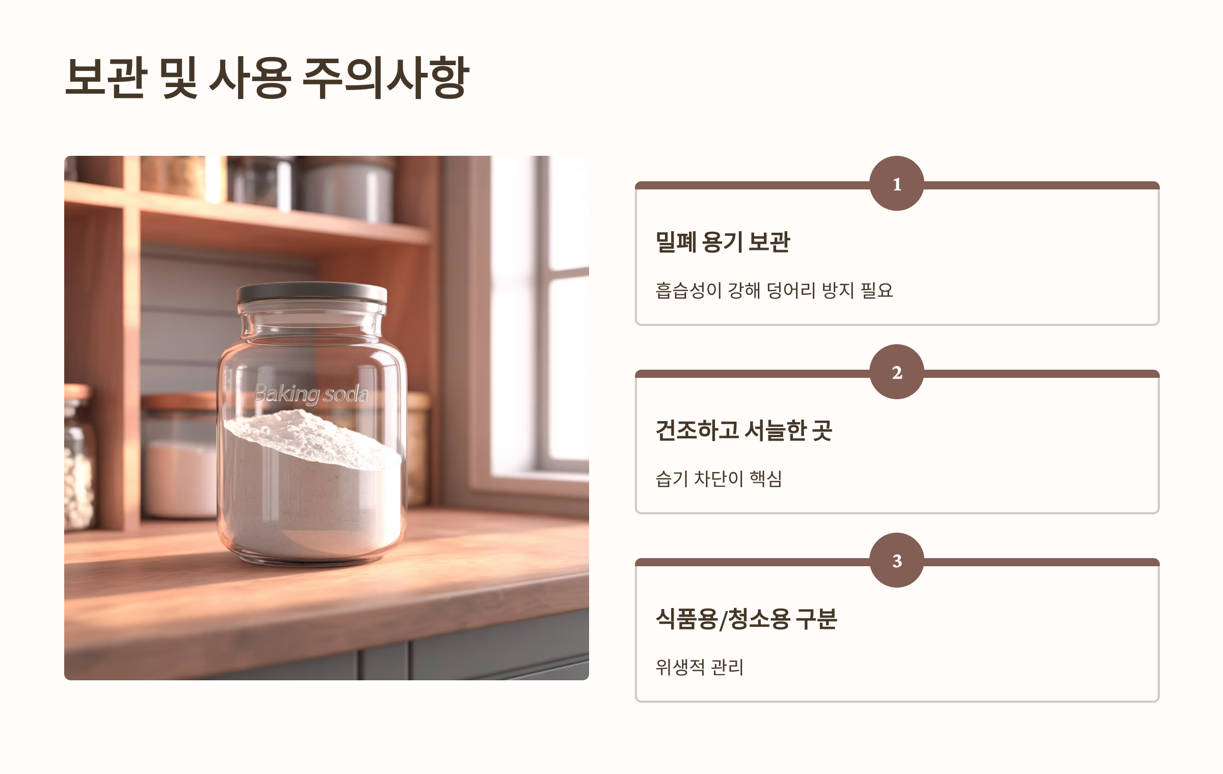 - 베이킹소다 보관 시 유의사항: 베이킹소다는 흡습성(습기를 흡수하는 성질)이 매우 강하므로, 덩어리가 지지 않도록 밀폐 용기에 담아 건조하고 서늘한 곳에 보관해야 합니다. 또한, 식품용과 청소용을 구분하여 보관하는 것이 위생적입니다.