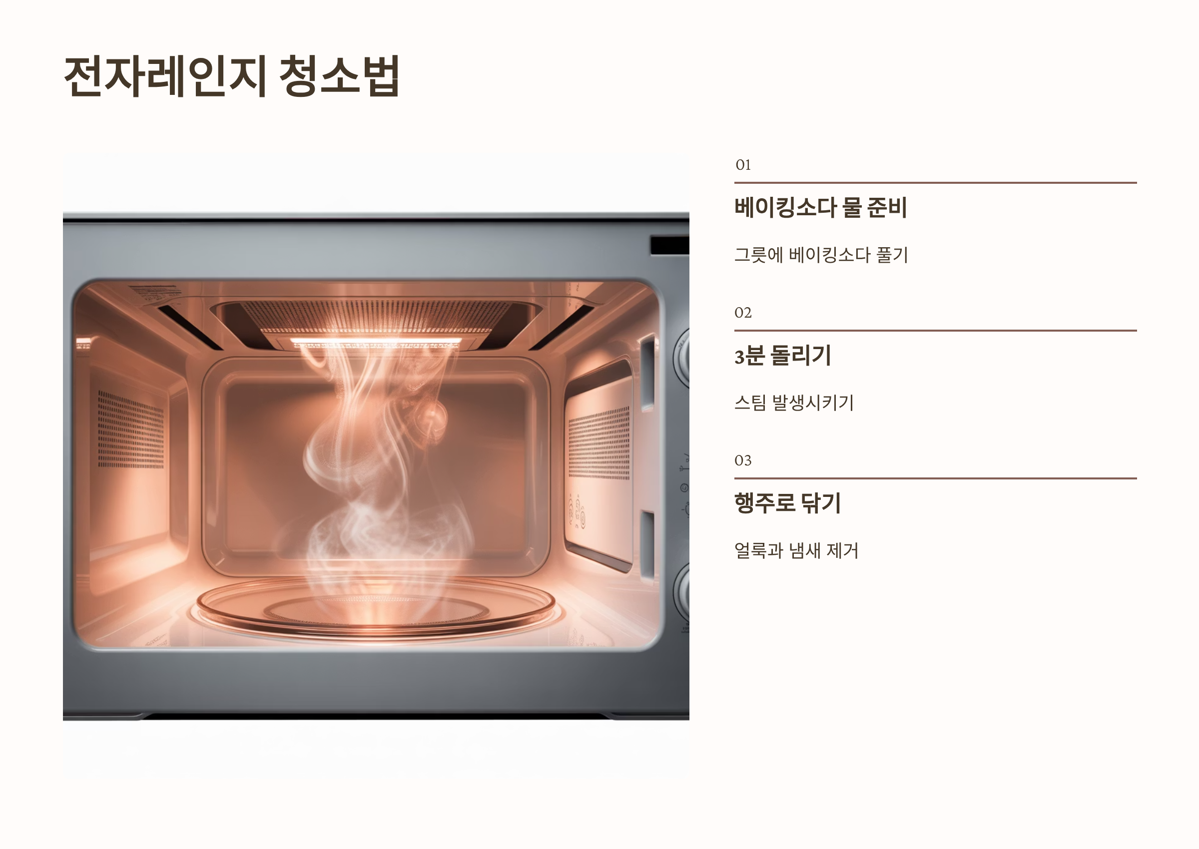 물에 베이킹소다를 푼 그릇을 넣고 3분간 돌린 후, 스팀이 생기면 행주로 내부를 닦아낸다. | 음식물 얼룩과 냄새를 불리고 중화하여 쉽게 닦아낸다. |