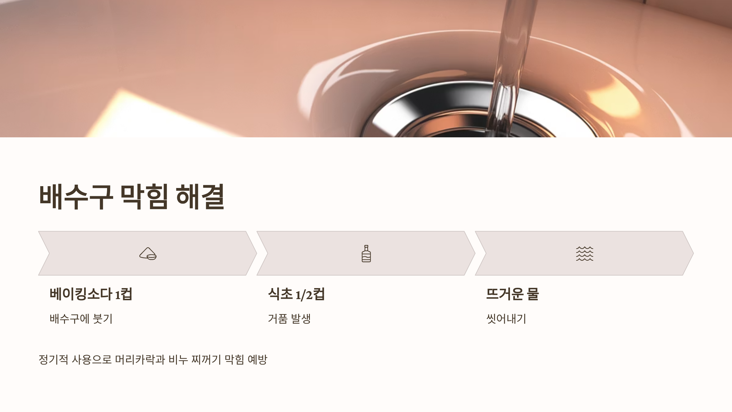 - 배수구 막힘 방지: 배수구에 정기적으로 베이킹소다와 식초를 부어 거품을 낸 후 뜨거운 물로 씻어내면, 머리카락과 비누 찌꺼기 등이 배관에 엉겨 붙어 막히는 것을 예방할 수 있습니다.