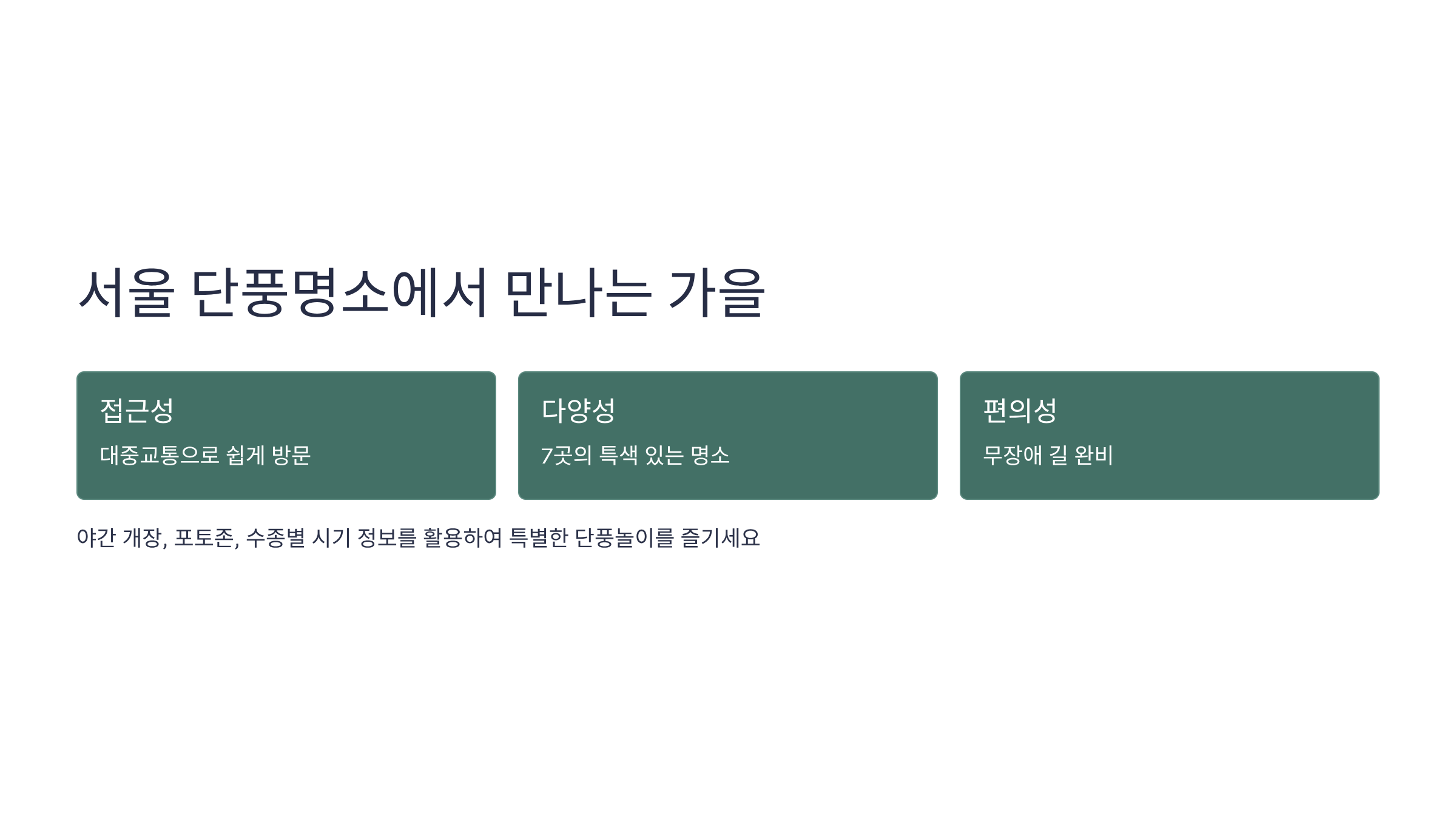 이 글은 서울 시민들이 가장 사랑하는 단풍 명소 7곳을 엄선하여 그 특징과 최적의 방문 시기를 안내합니다. 특히 퇴근 후나 주말 저녁에 단풍과 아름다운 도시 야경을 동시에 즐길 수 있는 야간 개장 명소 정보와 관람 팁을 제공합니다. 또한, 인생 사진을 남길 수 있는 명소별 베스트 포토존을 추천하고, 휠체어나 유모차도 편안하게 단풍을 감상할 수 있는 무장애 길 코스까지 상세히 소개합니다. 서울단풍명소의 수종별 단풍 시기와 특징을 파악하여 가장 아름다운 순간을 놓치지 않고 즐기시기를 바랍니다.
