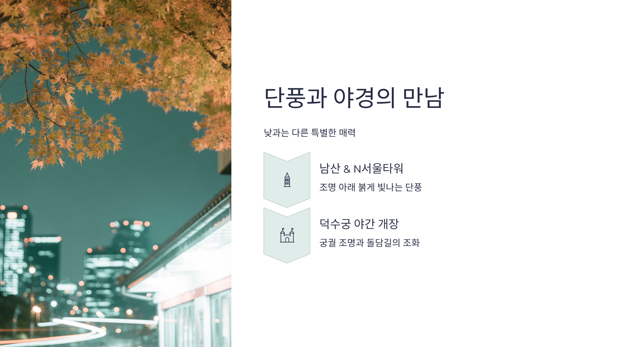낮의 단풍과는 또 다른 매력을 선사하는 단풍 야경은 서울단풍명소에서만 경험할 수 있는 특별한 즐거움입니다.