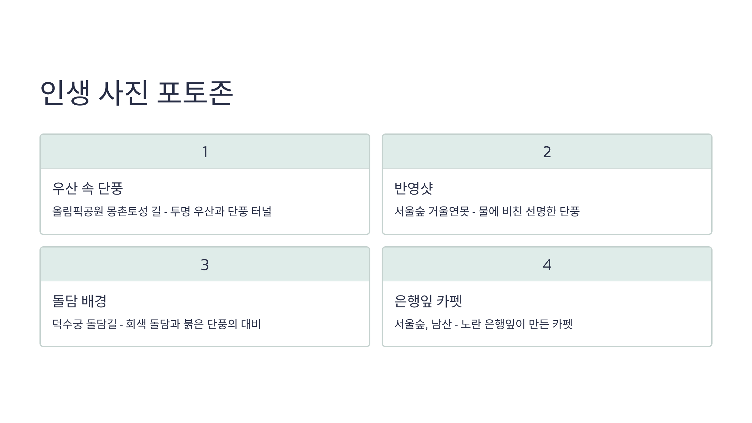 - 우산 속 단풍 사진 (올림픽공원): 올림픽공원의 몽촌토성 길은 단풍나무가 길게 늘어서 있어 터널 같은 분위기를 연출합니다. 붉은 단풍잎이 떨어져 길에 깔렸을 때, 투명 우산을 쓰고 걷는 모습을 사진에 담으면 깊은 감성이 느껴지는 사진을 얻을 수 있습니다.