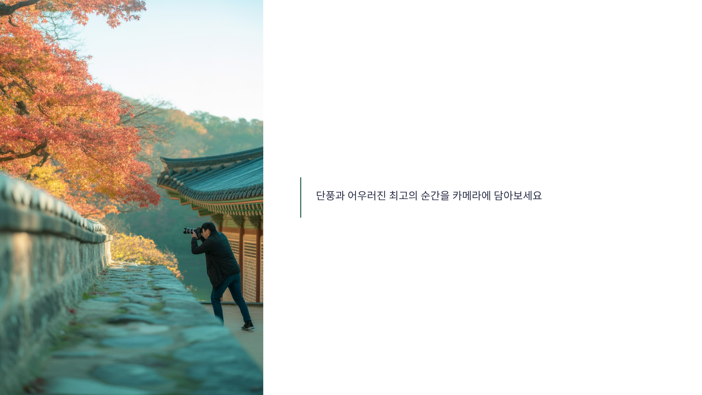 - 돌담 배경 (덕수궁 돌담길): 덕수궁의 회색 돌담은 붉은 단풍이나 노란 은행잎의 색깔을 더욱 돋보이게 하는 완벽한 배경입니다. 인물 사진을 찍을 때는 인물을 돌담 옆에 배치하고 단풍을 아웃포커싱하여 배경으로 활용하면 좋습니다.