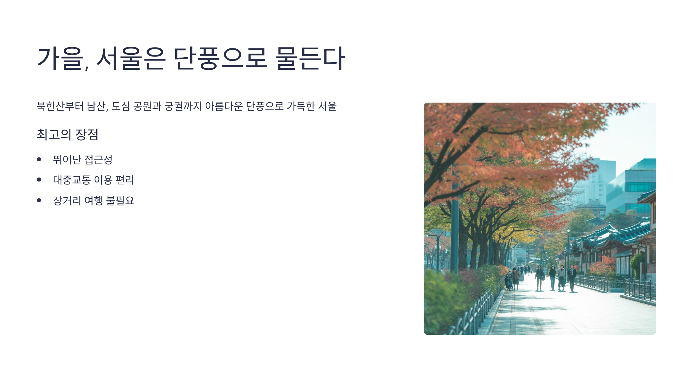 - 덕수궁 돌담길: 고궁의 고풍스러운 담벼락을 따라 은행나무와 단풍나무가 어우러져 서울에서 가장 낭만적인 단풍길로 손꼽힙니다.