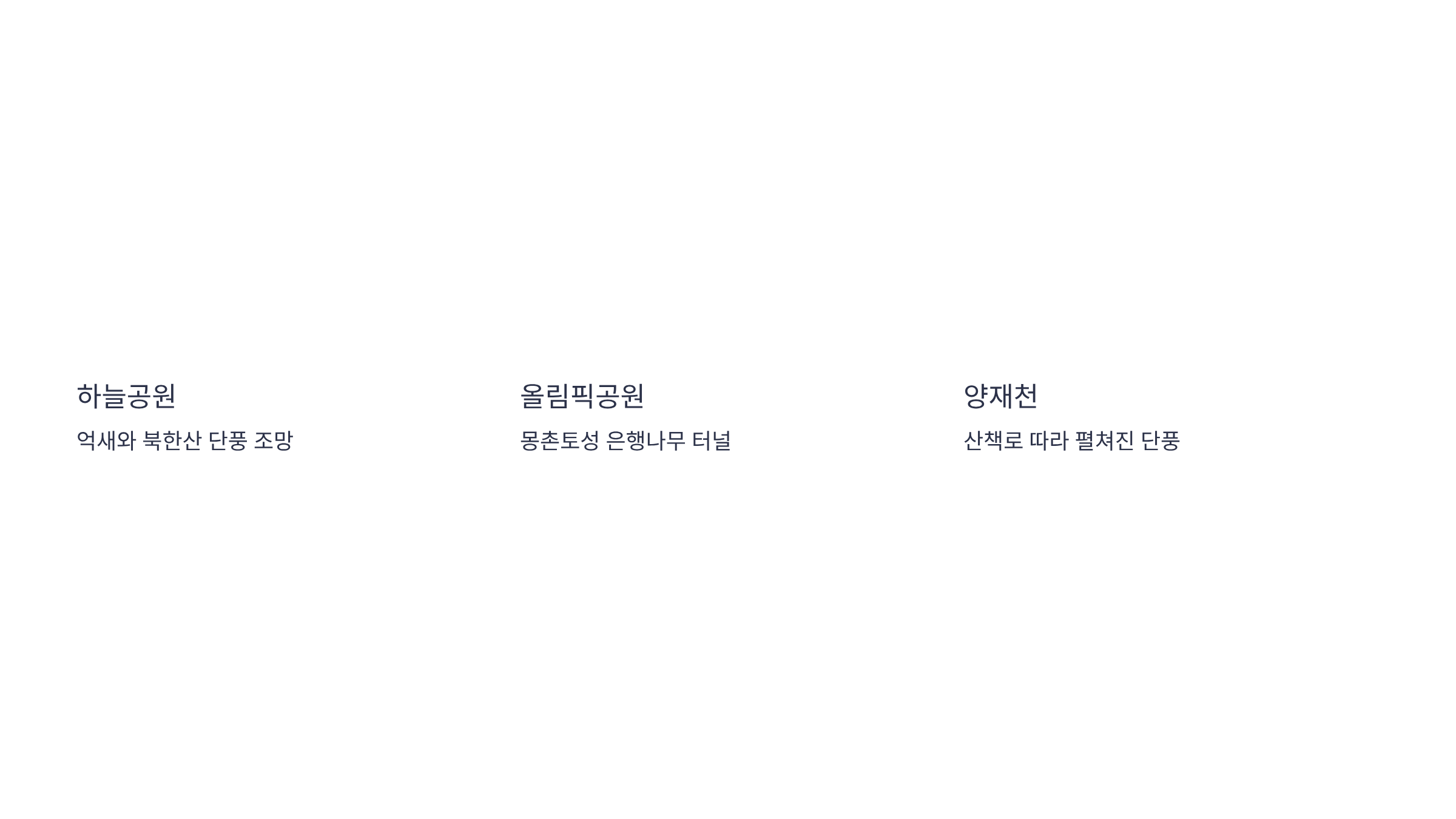 - 양재천: 양재천을 따라 길게 조성된 산책로에 단풍나무와 버즘나무 등이 식재되어 있어 가벼운 산책과 함께 단풍을 즐기기 좋습니다.