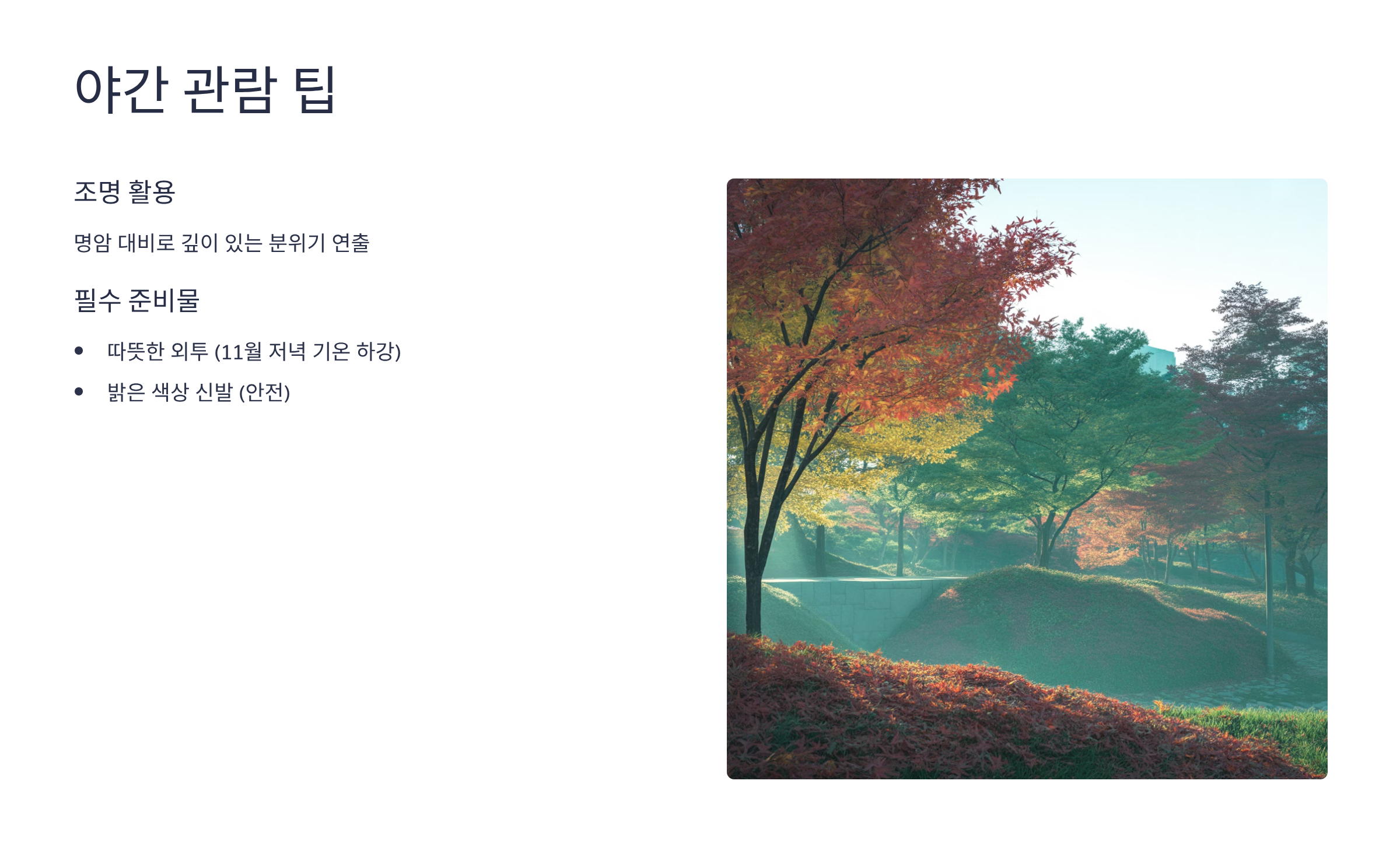 - 준비물: 11월 저녁은 기온이 급격히 내려가므로, 야간 관람 시에는 반드시 따뜻한 외투를 준비해야 하며, 안전을 위해 밝은 신발을 착용하는 것이 좋습니다.