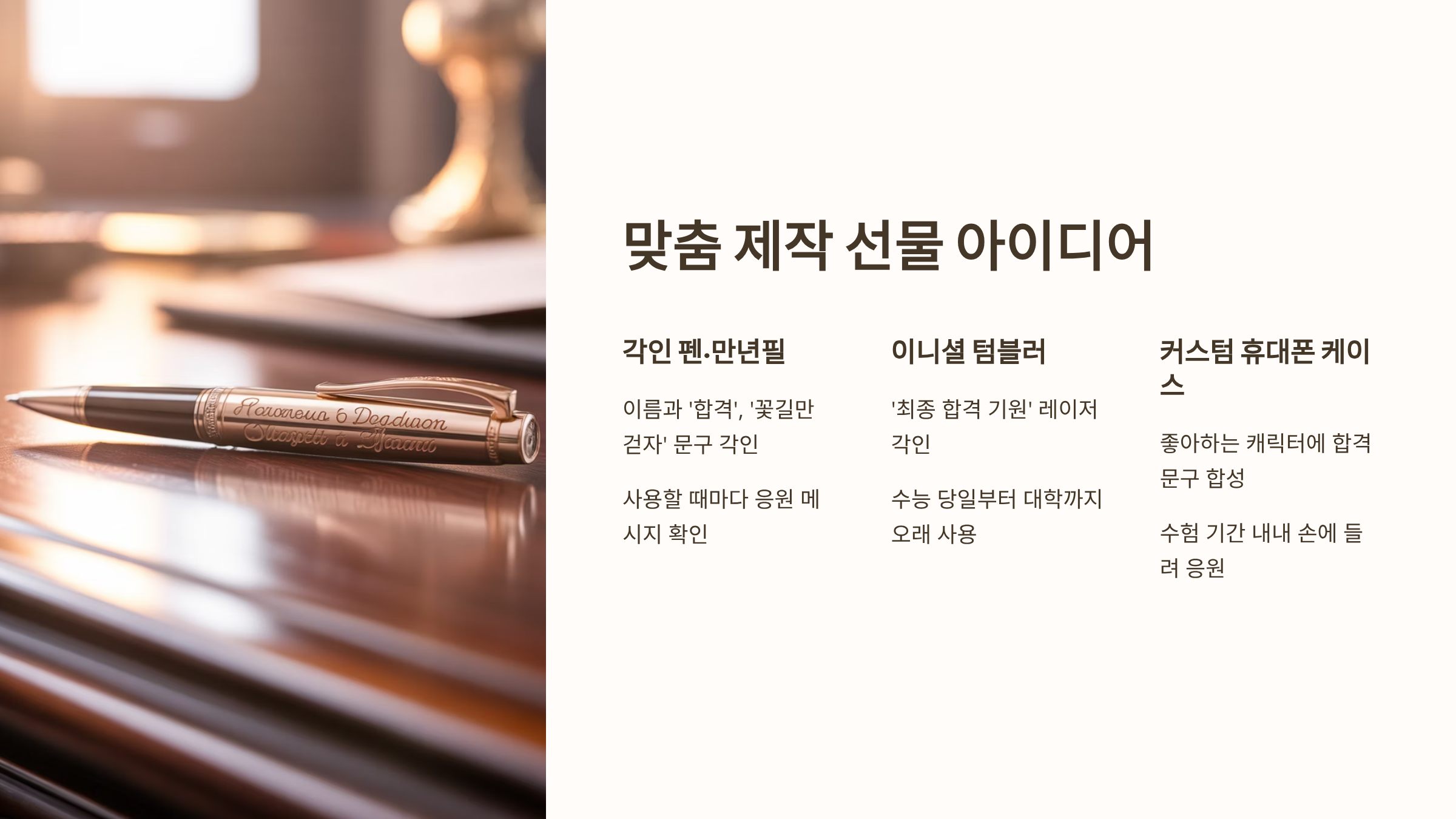 최근에는 선물의 기능성(실용성)과 함께 합격 기원의 의미를 영구적으로 담는 맞춤 제작 선물이 인기를 얻고 있습니다.