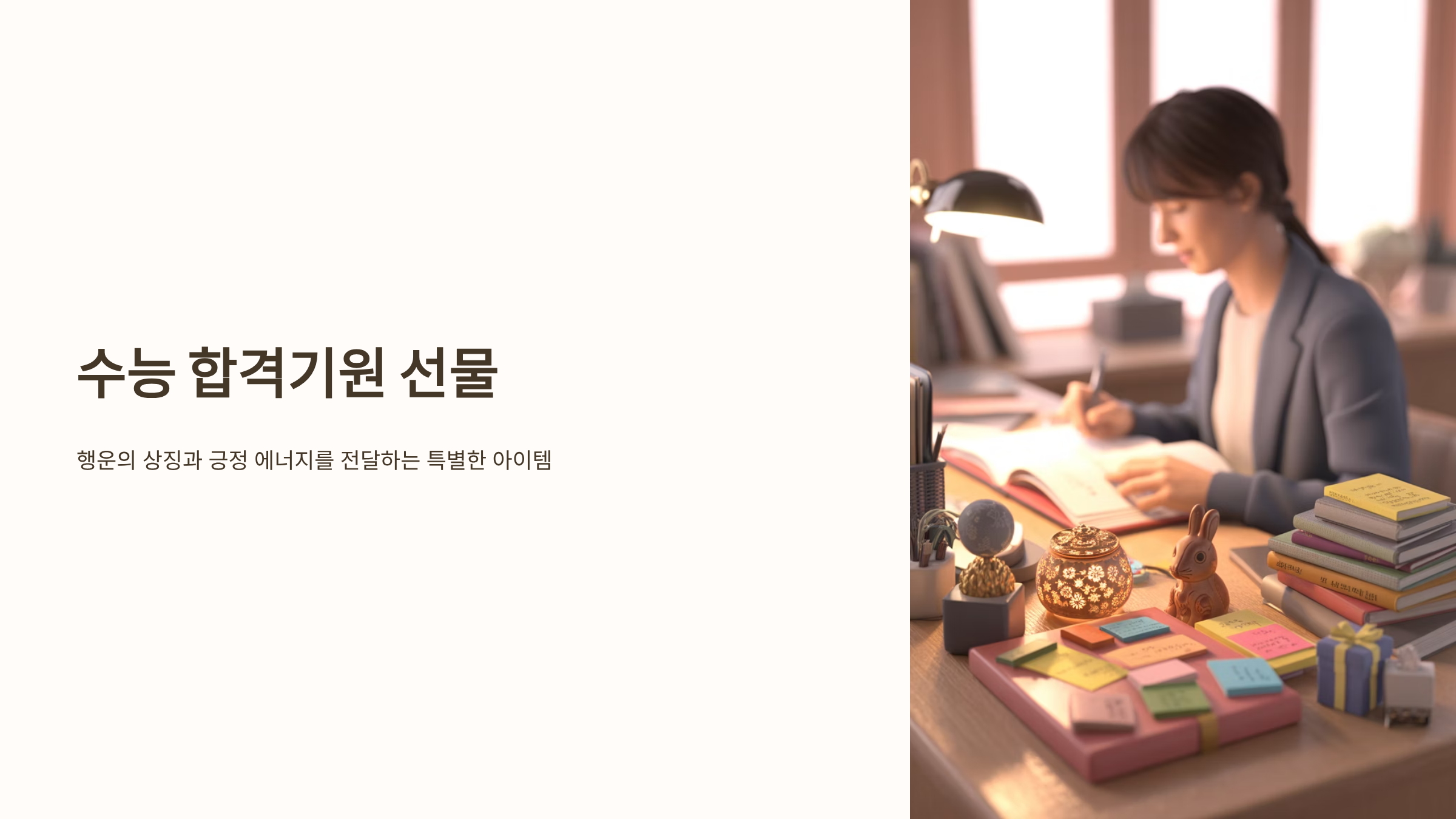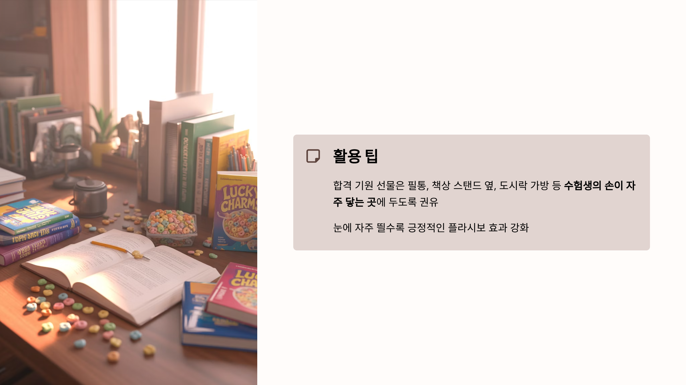 - 활용 팁: 합격 기원 선물은 반드시 수험생의 손이 자주 닿는 곳(필통, 책상 스탠드 옆, 도시락 가방)에 두도록 권유하는 것이 좋습니다. 눈에 자주 띌수록 긍정적인 플라시보 효과가 강화됩니다.