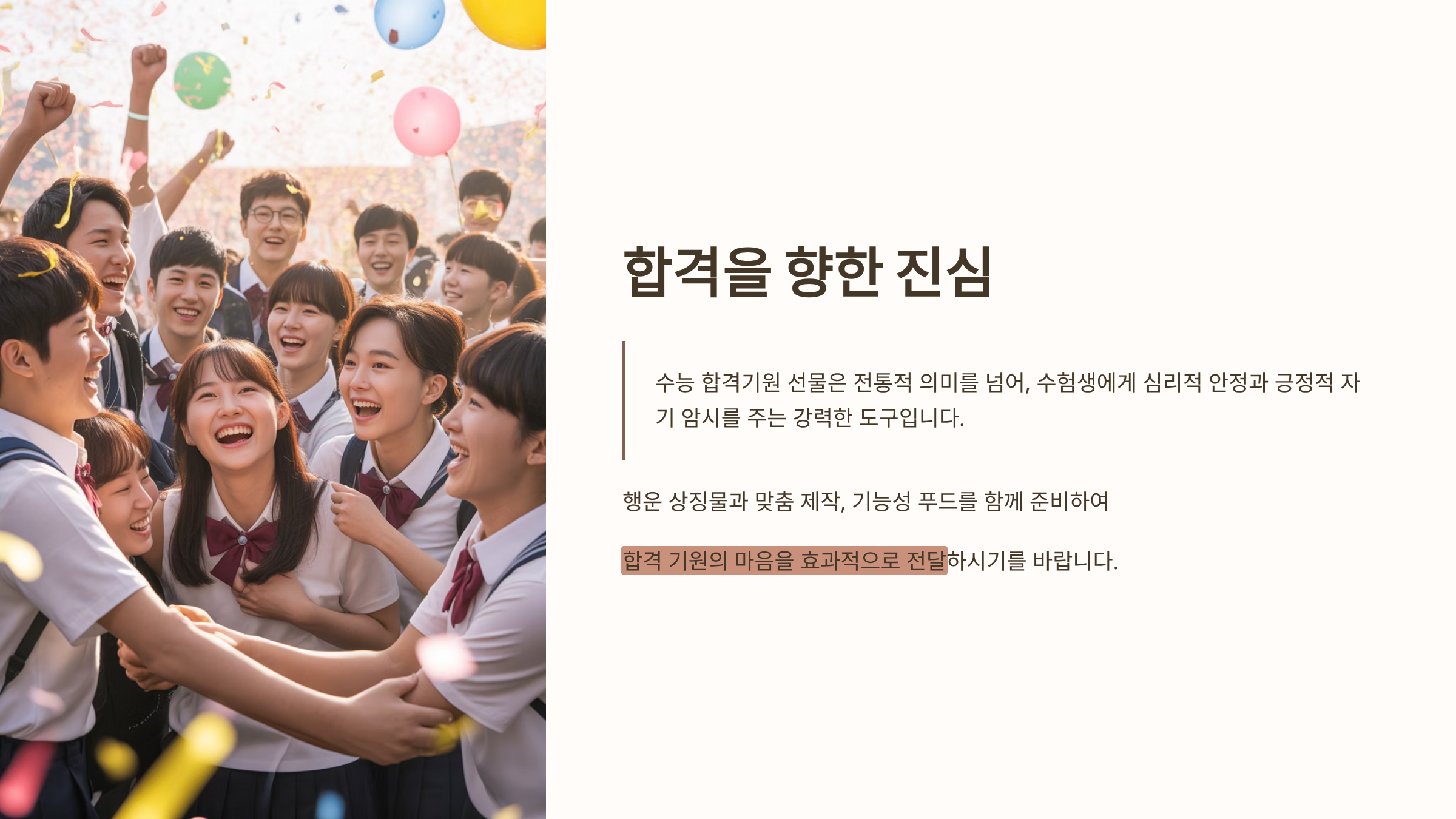 선물의 내용물 외에도 포장지에 합격 기원의 메시지를 담아 전달하는 것이 심리적 효과를 높입니다.